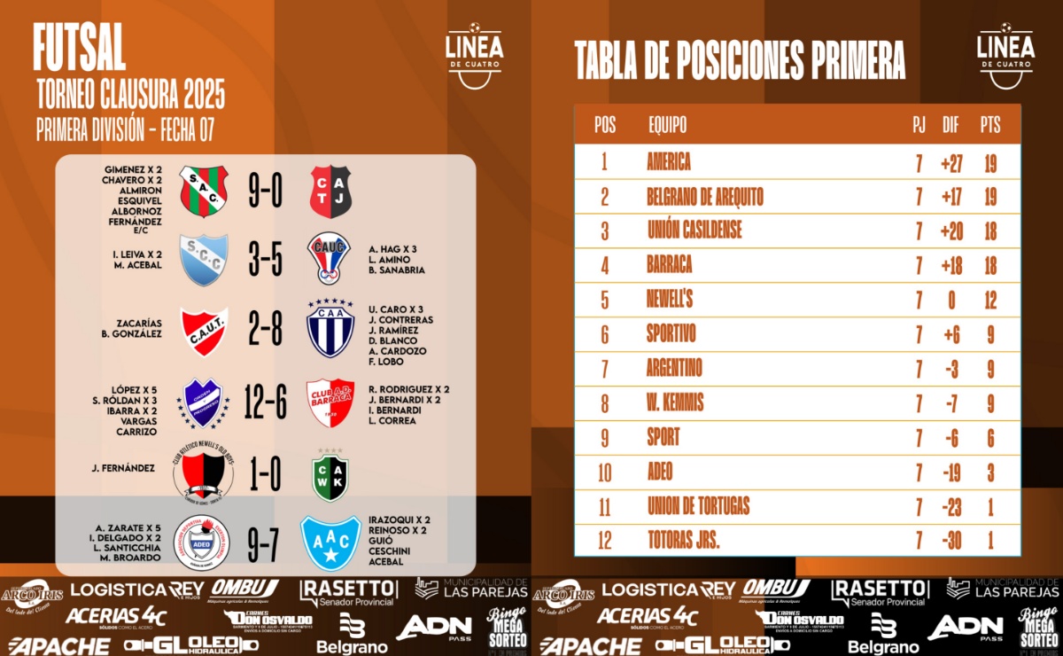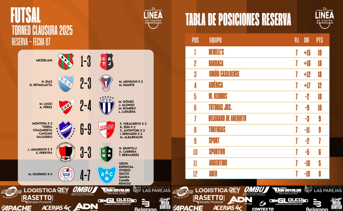 Se jugó la Fecha 07 del Torneo Clausura 2025 de Primera División y Reserva del Futsal de la Liga Cañadense y acá te compartimos los resultados y posiciones.