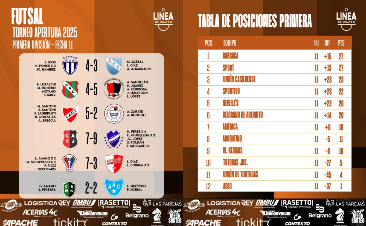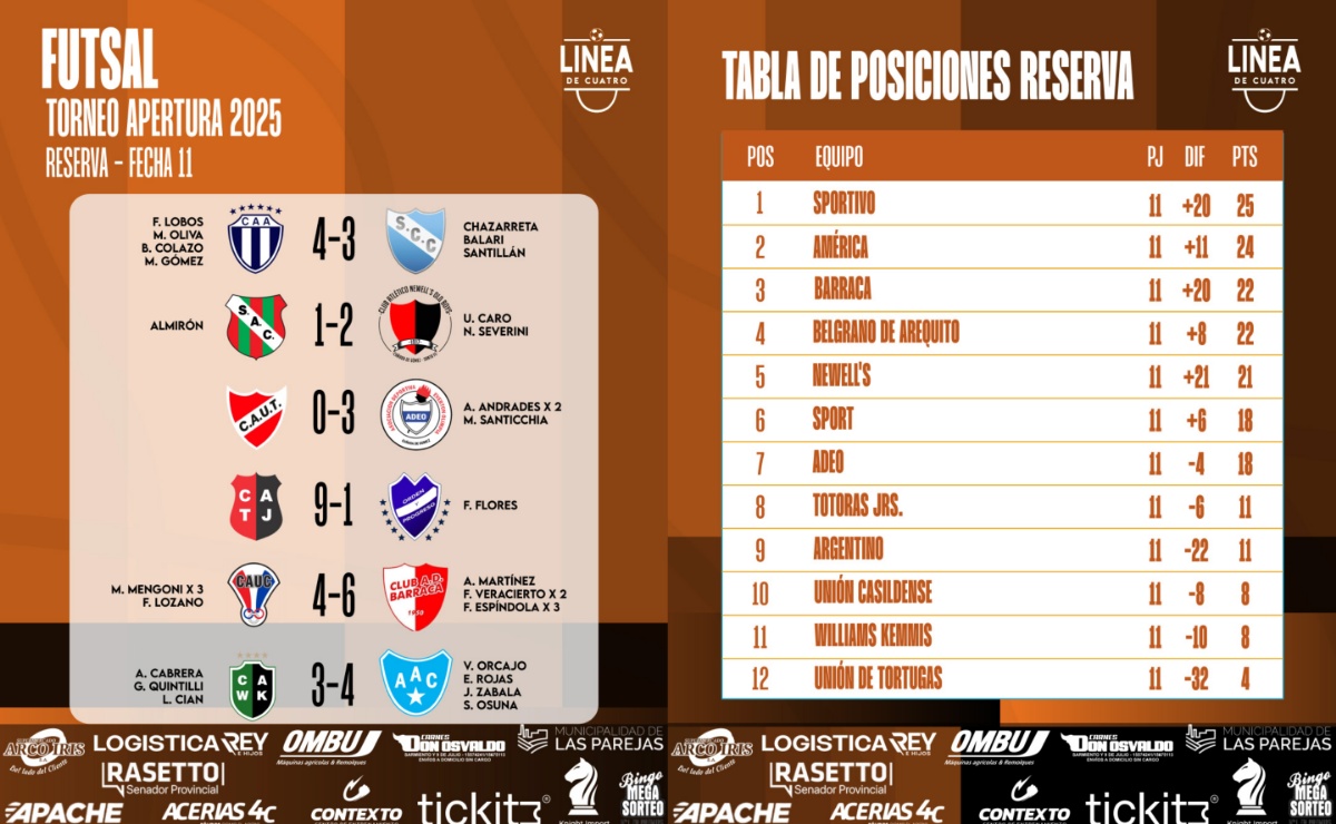 Se jugó la Fecha 11, la última de la fase regular, del Torneo Apertura 2025 de Primera División y Reserva del Futsal de la Liga Cañadense y acá te compartimos los resultados y posiciones.