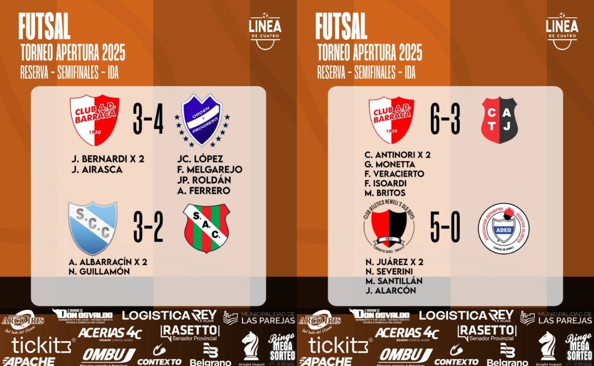 Se jugó la ida de las Semifinales del Torneo Apertura 2025 de Primera División y Reserva del Futsal de la Liga Cañadense y acá te compartimos los resultados.