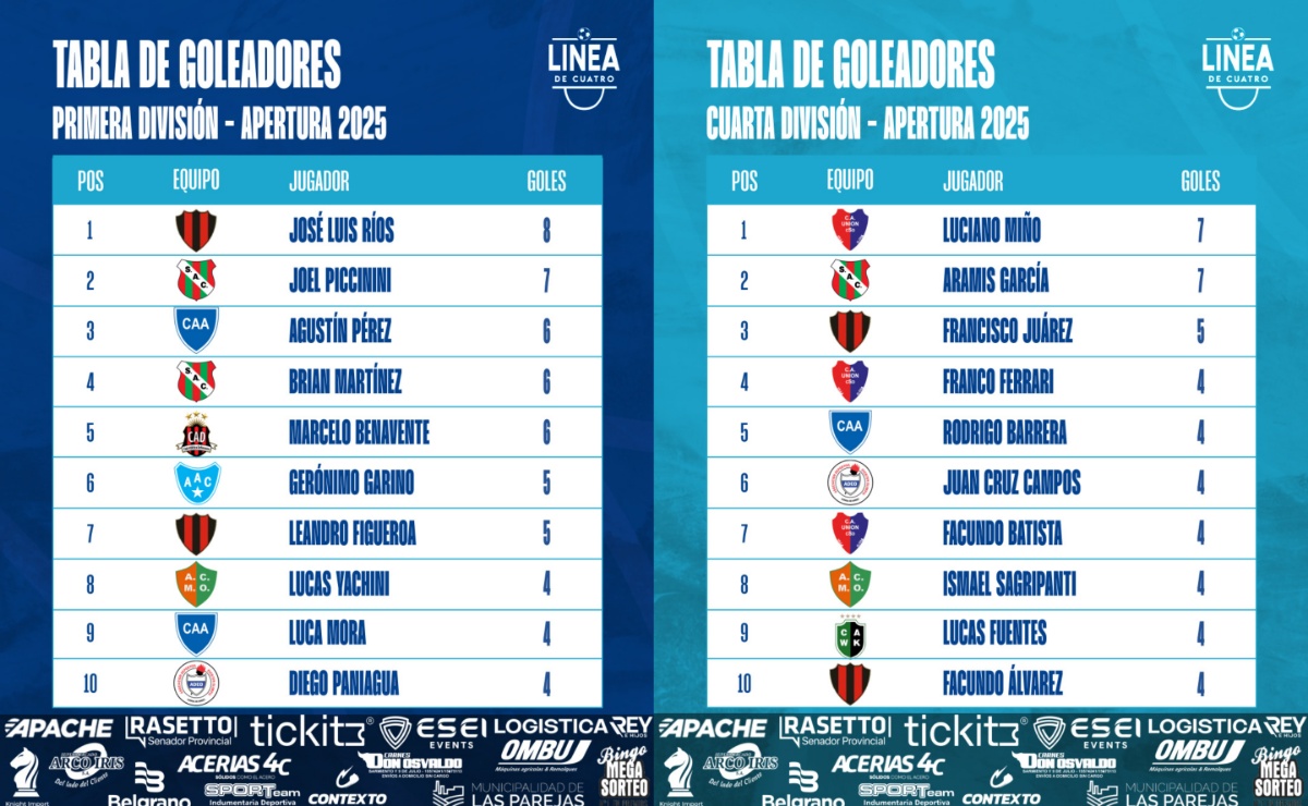Por detrás de Ríos aparecen Joel Piccinini (Sportivo) con 7 goles, Agustín Pérez (Almafuerte), Brian Martínez (Sportivo) y Marcelo Benavente (Defensores) con 6 goles.