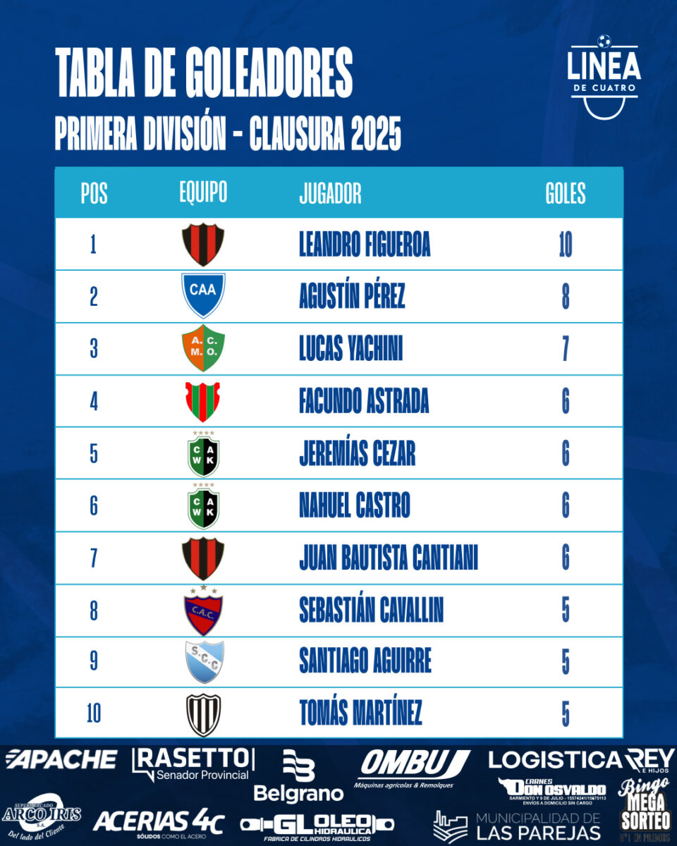Por detrás de Figueroa aparecen Agustín Pérez (Almafuerte), con 8 goles y Lucas Yachini (Montes de Oca) con 7 goles.