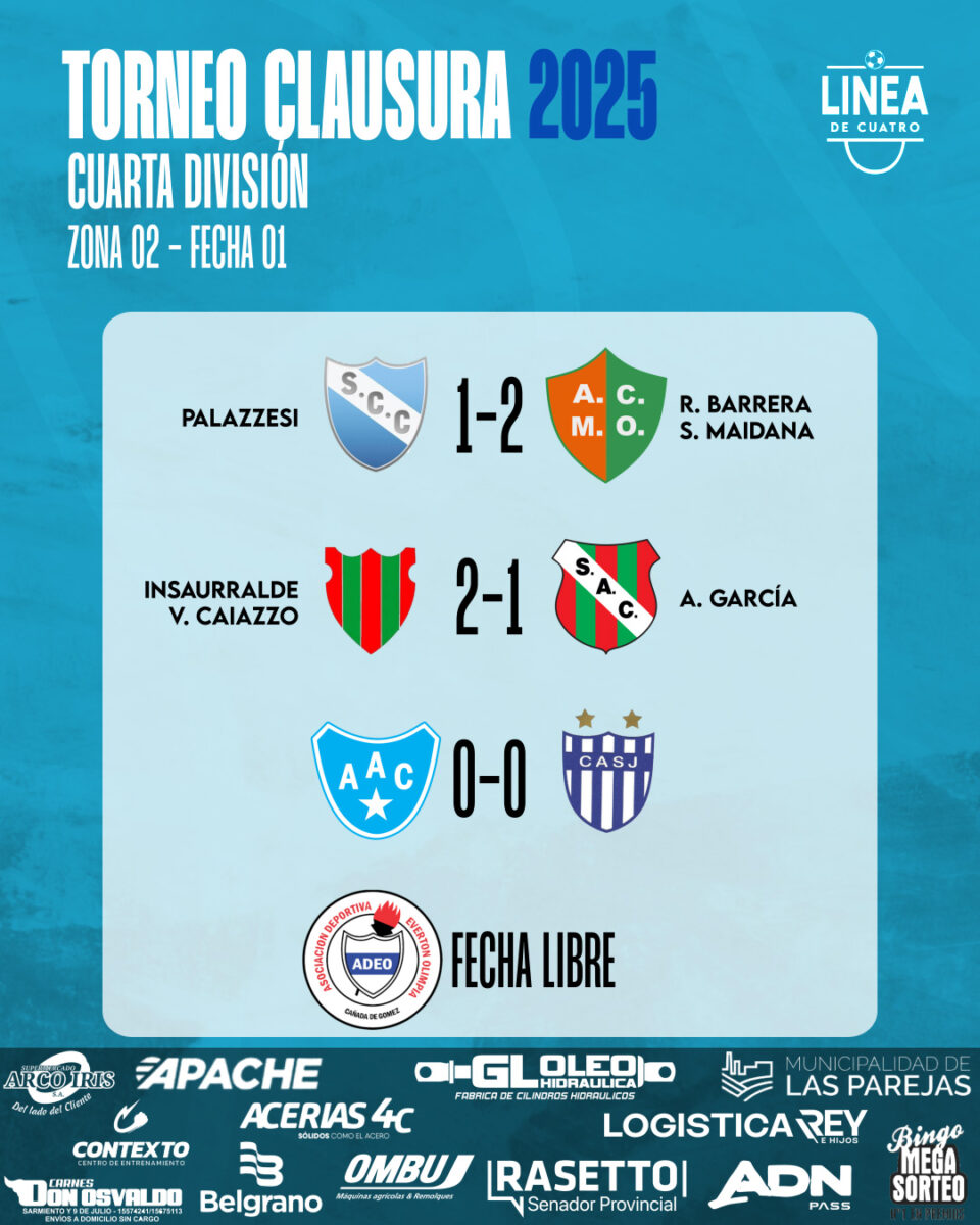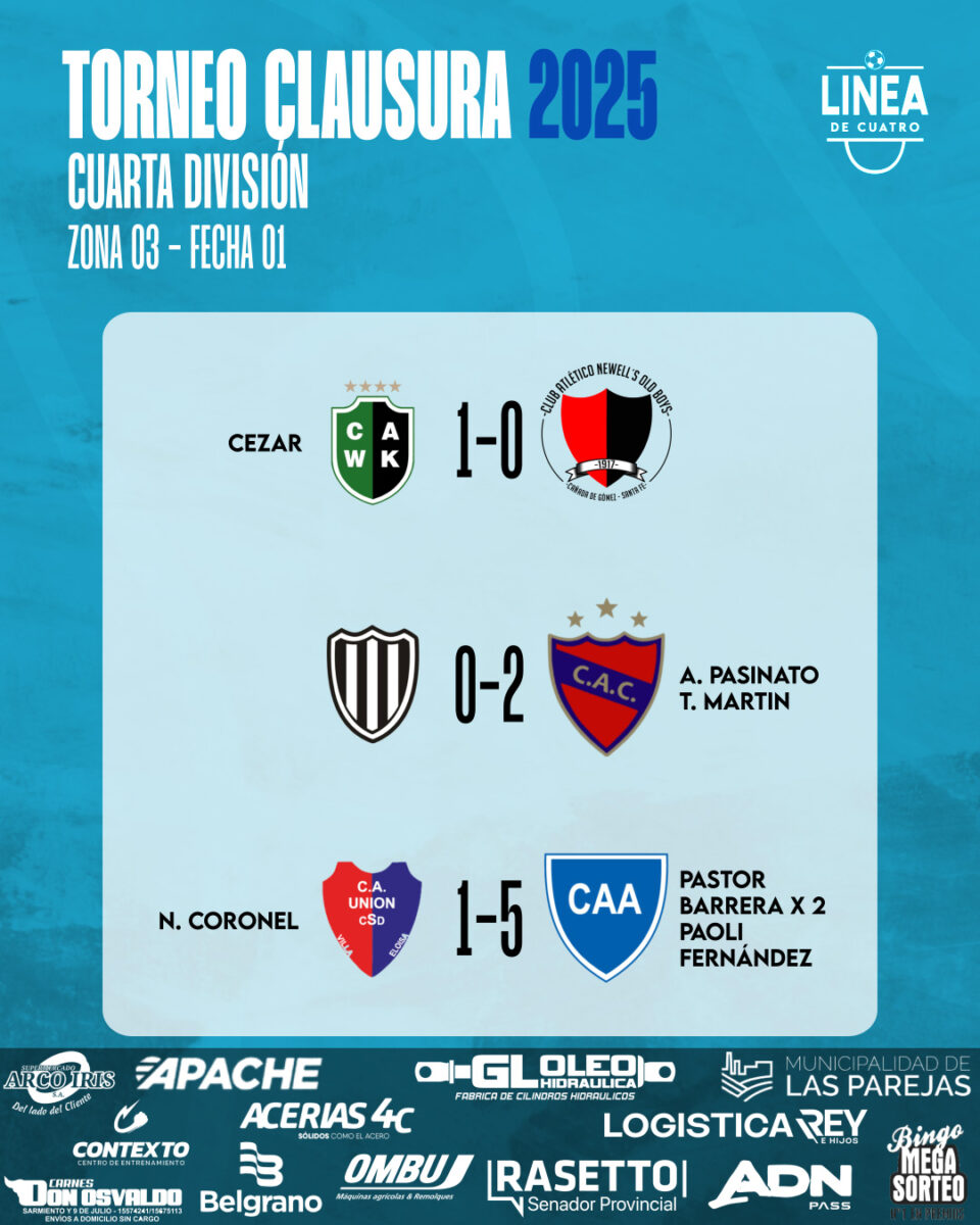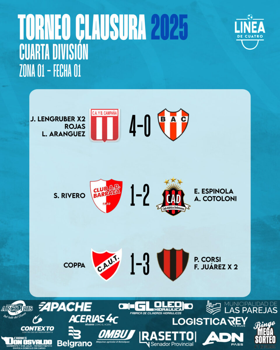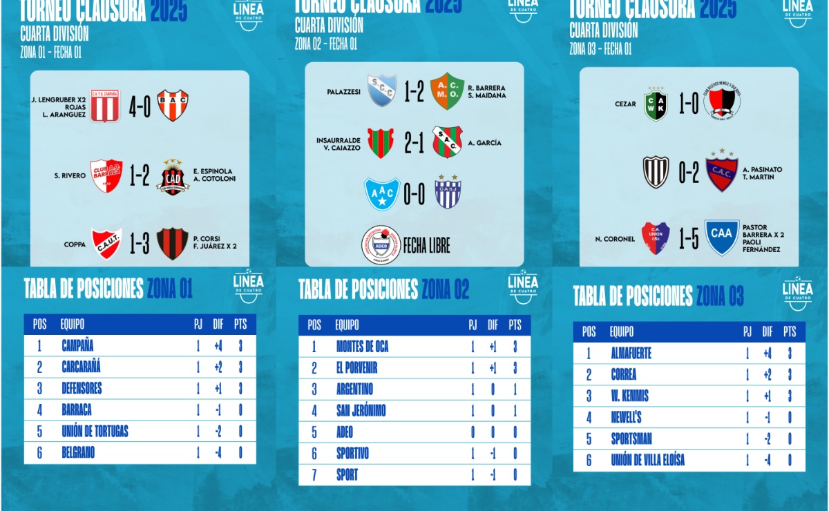 #LigaCañadenseDeFútbolSe jugó la primera fecha del Torneo Clausura 2025 de Cuarta División de la Liga Cañadense y acá te dejamos los resultados y posiciones. agosto 24, 2025 Cuarta División, Liga Cañadense Tags: Cuarta División ,Liga Cañadense ,Posiciones ,Resultados