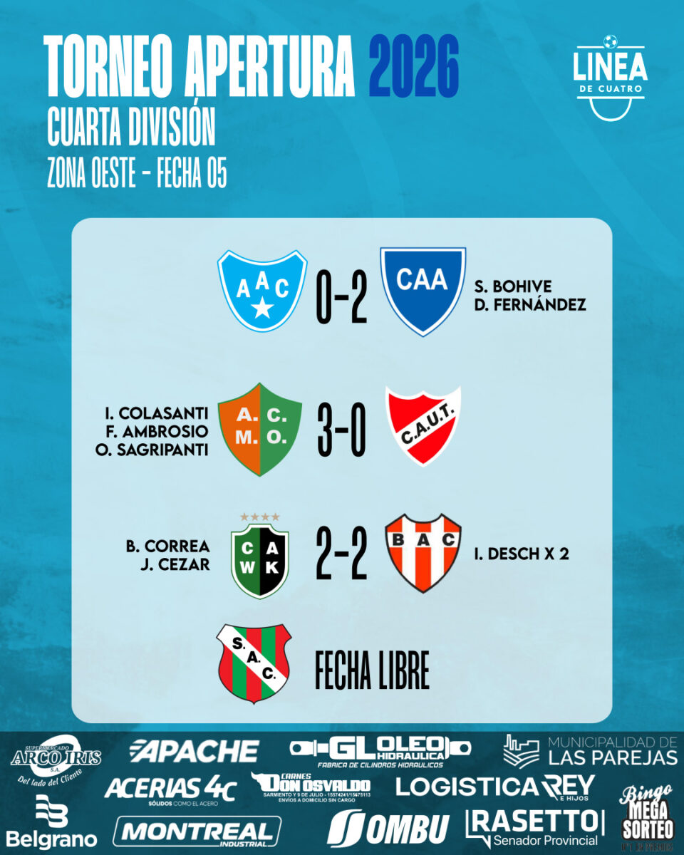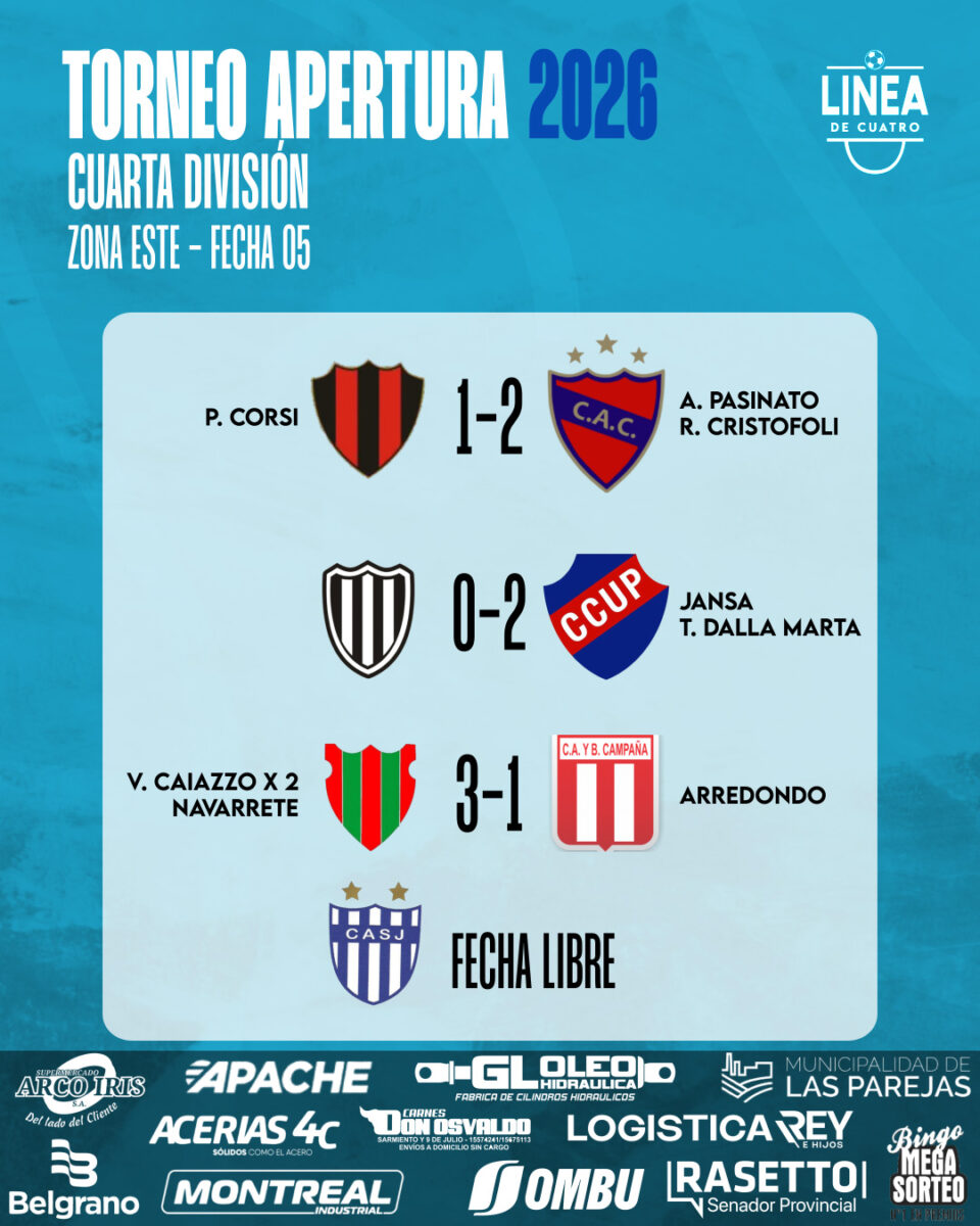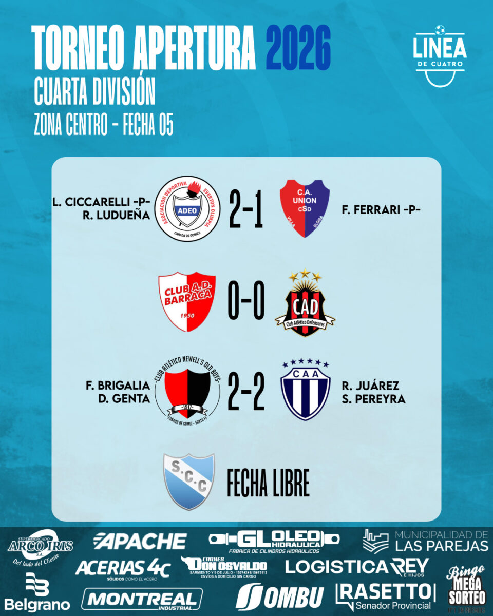 Se jugó la Fecha 05 del Torneo Apertura 2026 de Cuarta División de la Liga Cañadense y acá te dejamos los resultados y posiciones.