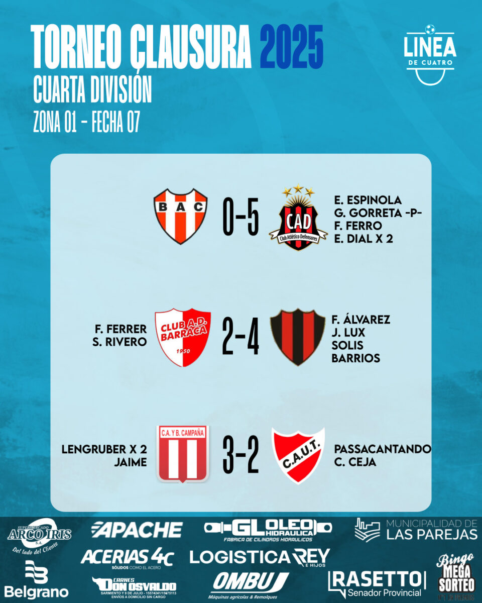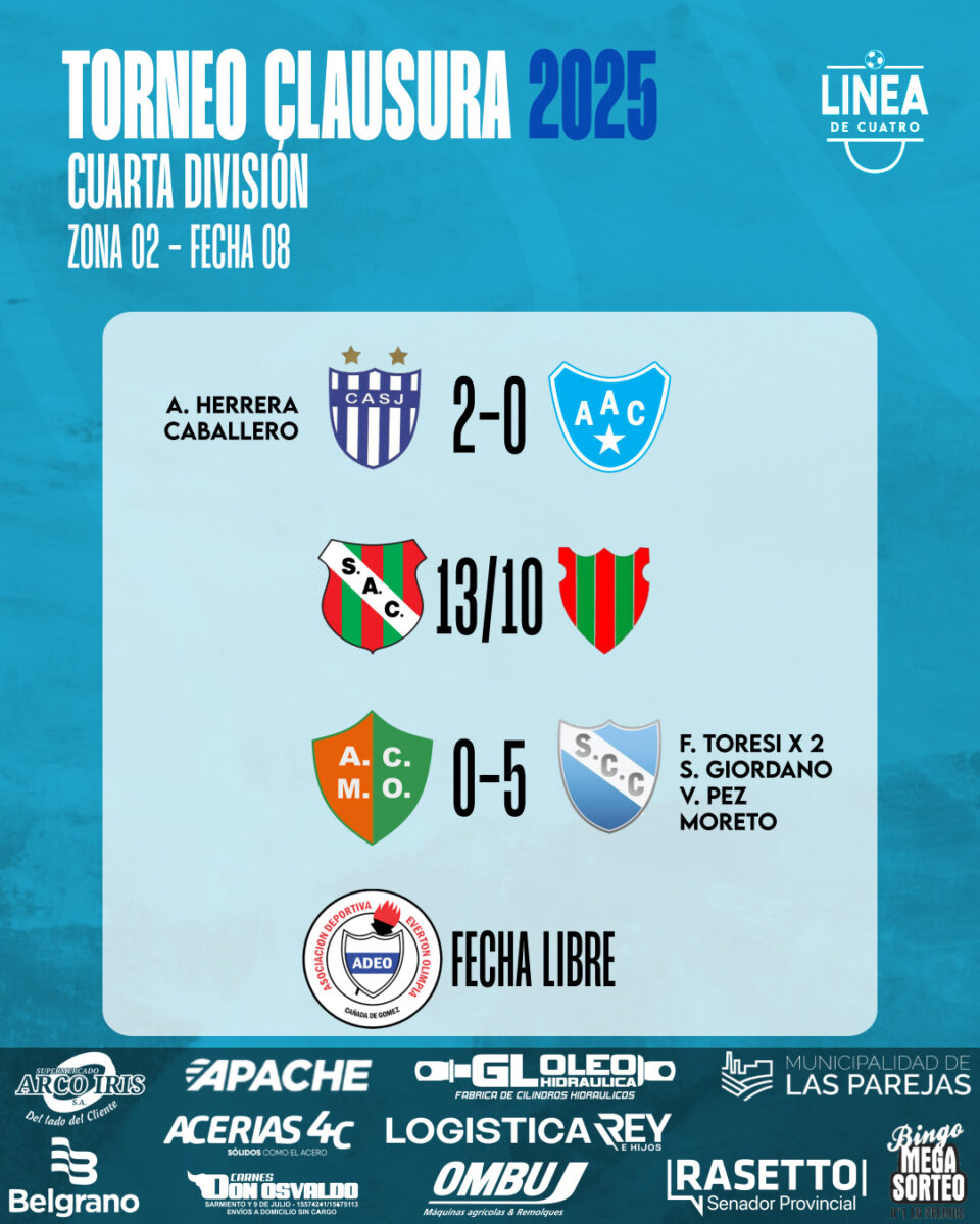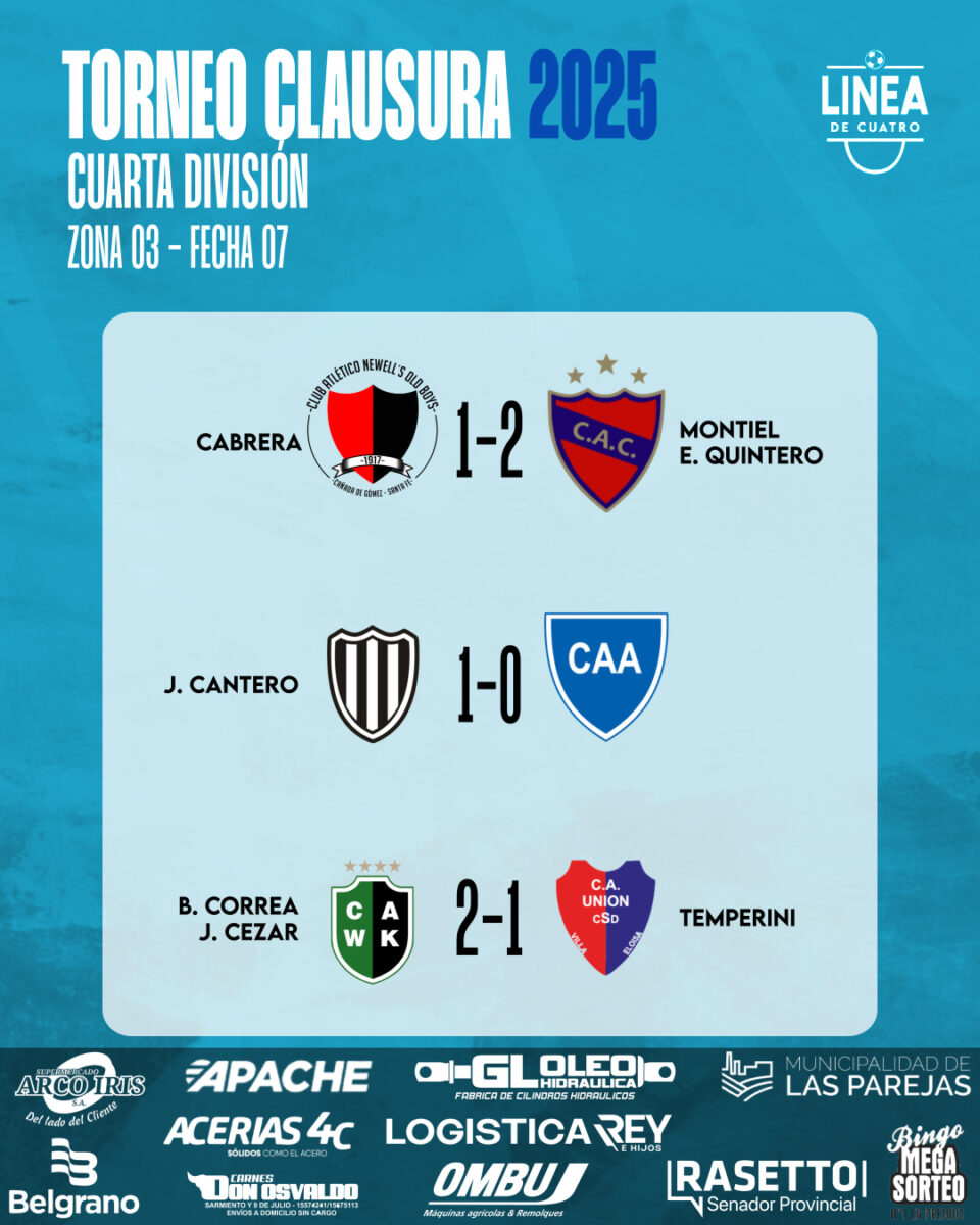 Se jugó la Fecha 07 de las Zonas 1 y 3 y la Fecha 08 de la Zona 2 del Torneo Clausura 2025 de Cuarta División de la Liga Cañadense y acá te dejamos los resultados y posiciones.