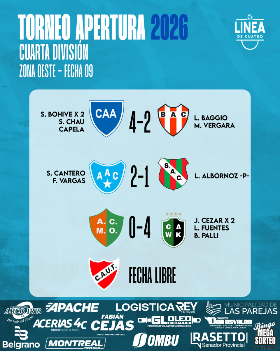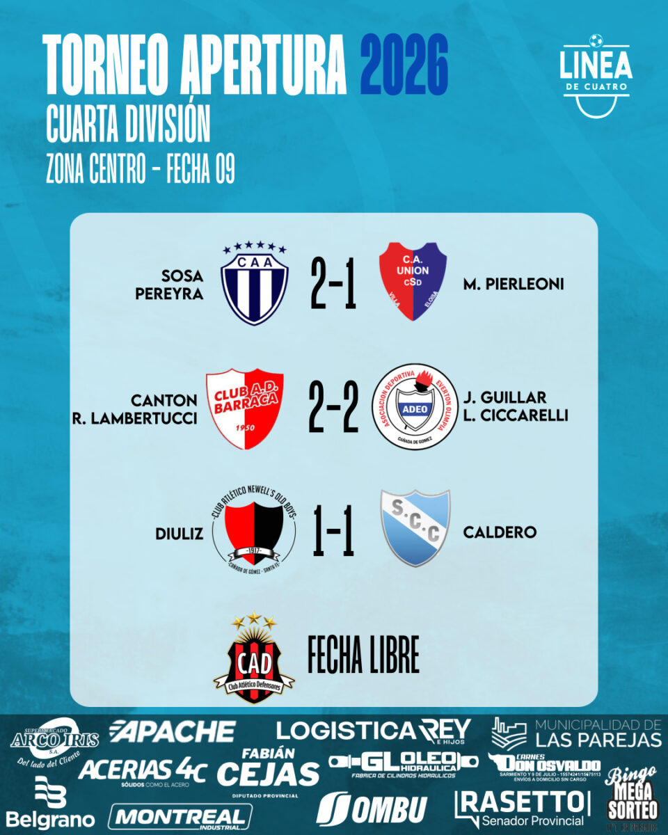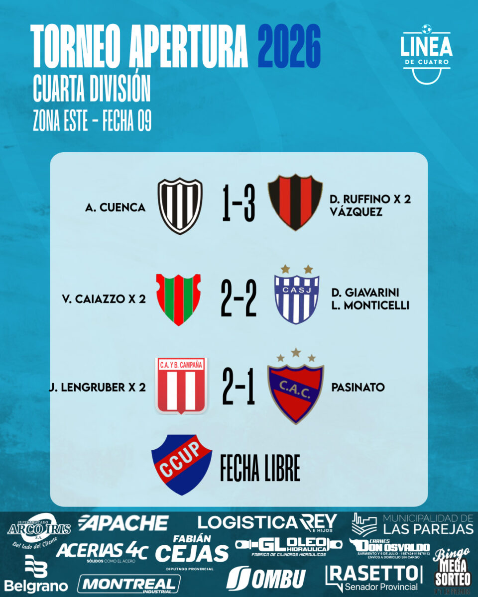 #LigaCañadenseDeFútbol #CuartaDivisiónSe jugó la Fecha 09 del Torneo Apertura 2026 de Cuarta División de la Liga Cañadense y acá te dejamos los resultados y posiciones. abril 19, 2026 Cuarta División, Liga Cañadense Tags: Apertura 2026 ,Cuarta División ,Fecha 09 ,Liga Cañadense