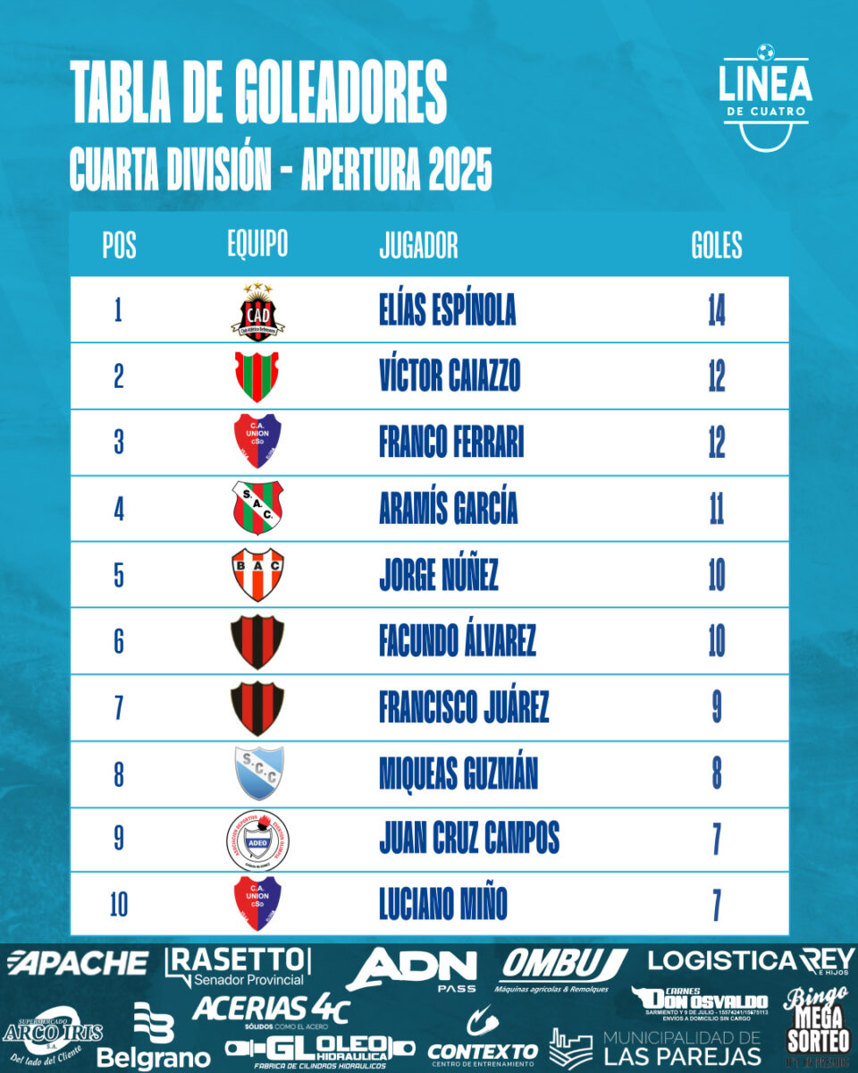 Por detrás de Espinola aparece Víctor Caiazzo (El Porvenir) y Franco Ferrari (Unión de Villa Eloísa) con 12 goles y Aramis García (Sportivo) con 11 goles.