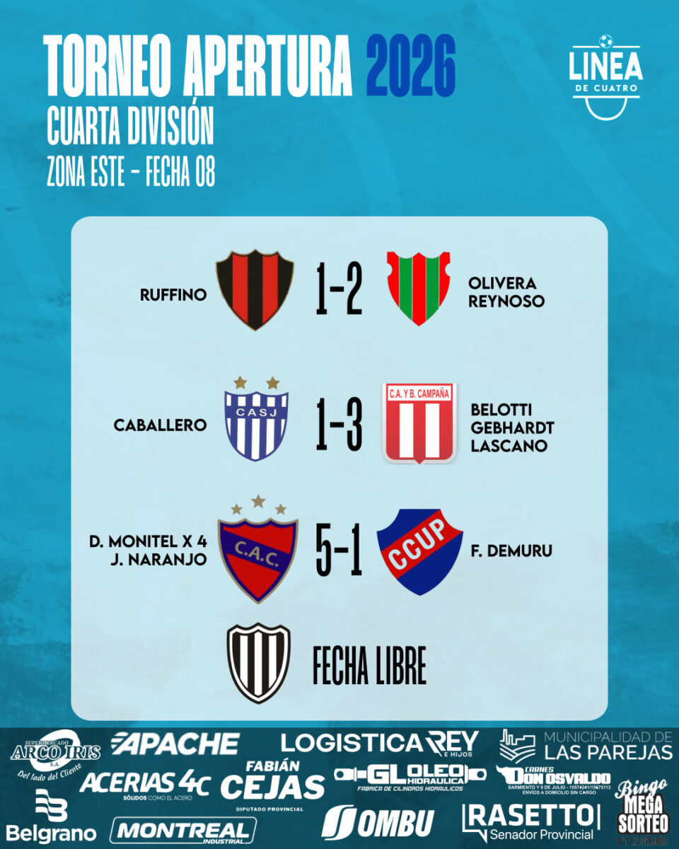 Se jugó la Fecha 08 del Torneo Apertura 2026 de Cuarta División de la Liga Cañadense y acá te dejamos los resultados y posiciones.