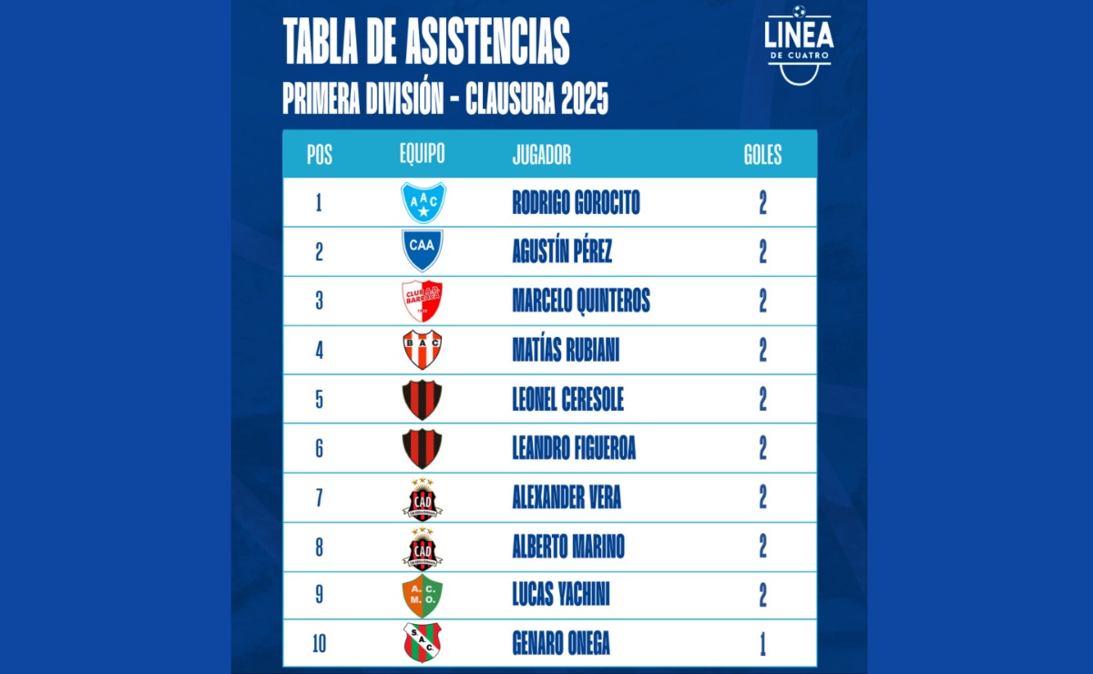 #LigaCañadenseDeFútbolLa tabla de asistencias de Primera División tras la Fecha 03 del Torneo Clausura 2025 de la Liga Cañadense. septiembre 9, 2025 Liga Cañadense Tags: Asistencias ,Clausura 2025 ,Liga Cañadense ,Primera División