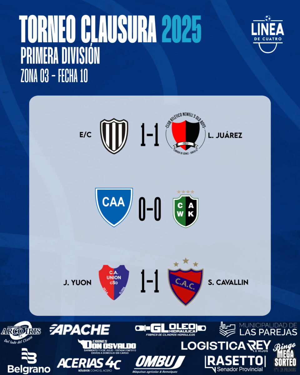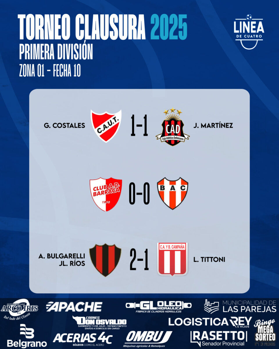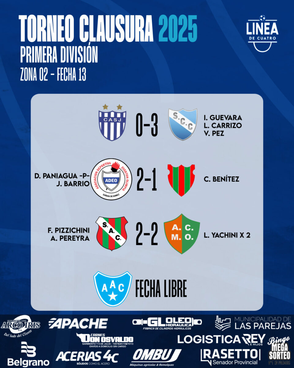 Se jugó la Fecha 10, la última, de las Zonas 1 y 3 y la Fecha 13 la penúltima, de la Zona 2 del Torneo Clausura 2025 de Primera División de la Liga Cañadense y acá te dejamos los resultados.