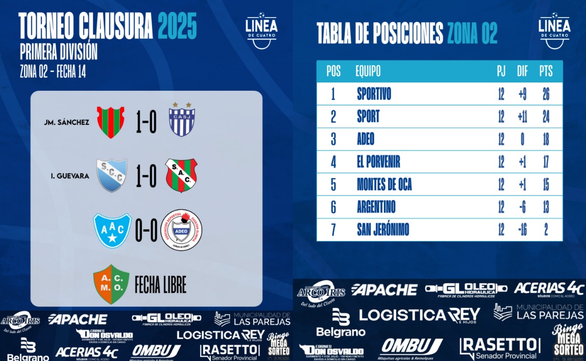 Se jugó la Fecha 14, la última, de la Zona 2 del Torneo Clausura 2025 de Primera División de la Liga Cañadense y acá te dejamos los resultados y posiciones.