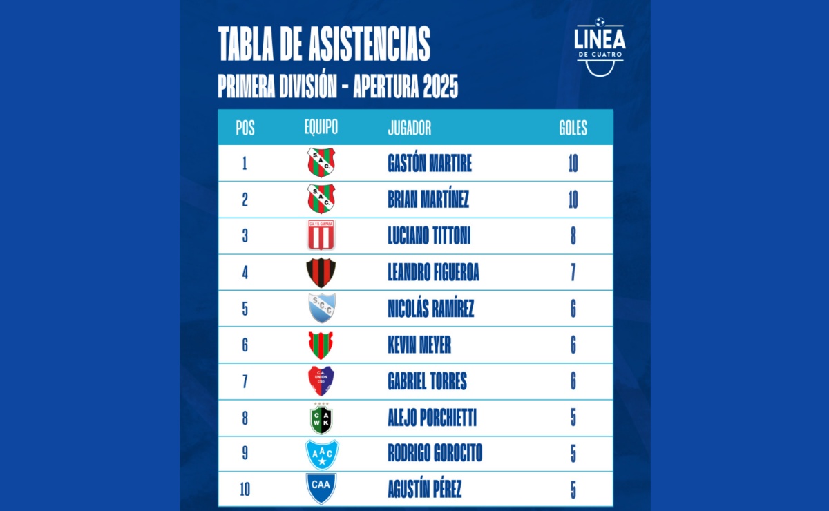 Gastón Martire y Brian Martínez fueron los máximos asistidores de la fase regular del Torneo Apertura 2025 de Primera División.