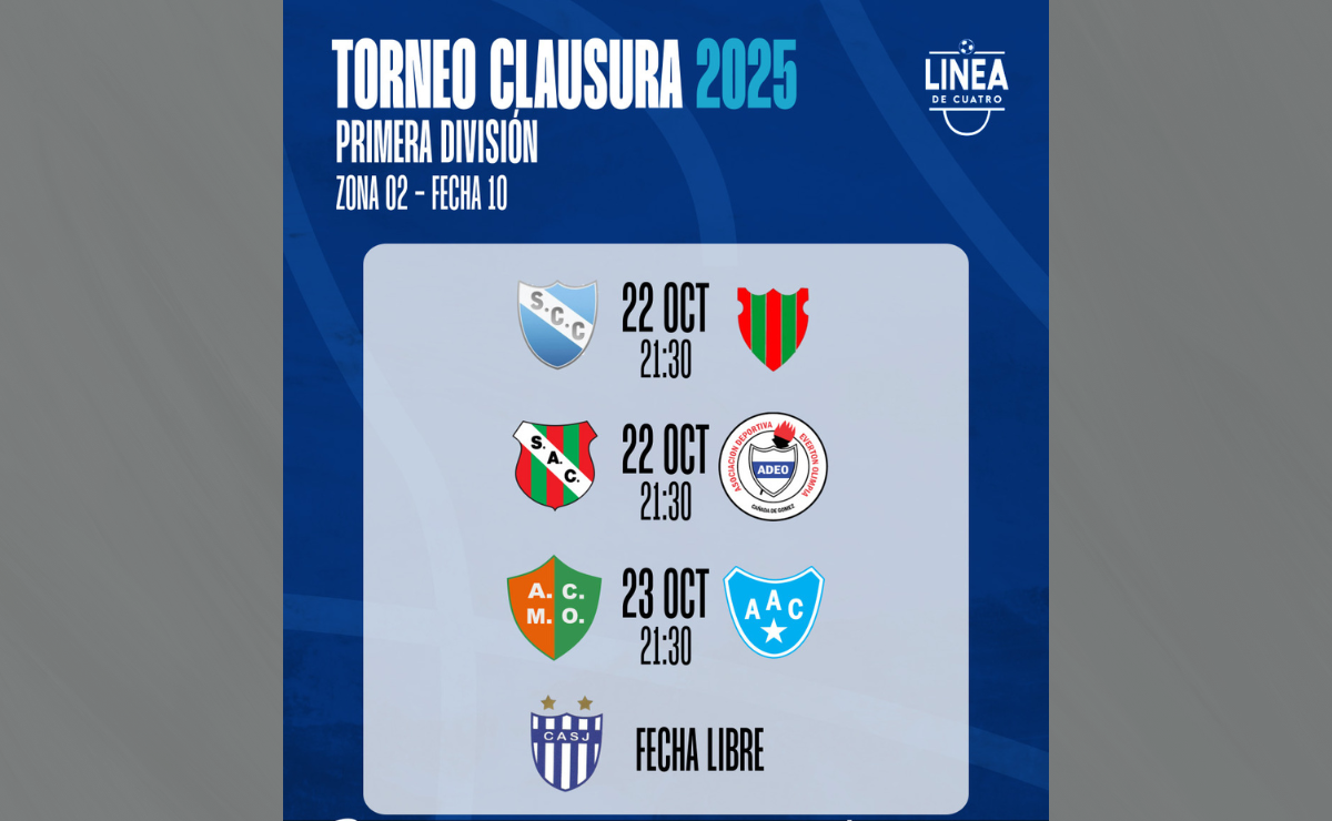 Así se jugará la la Fecha 10 de la Zona 2 del Torneo Clausura 2025 de Primera y Cuarta División de la Liga Cañadense de Fútbol.