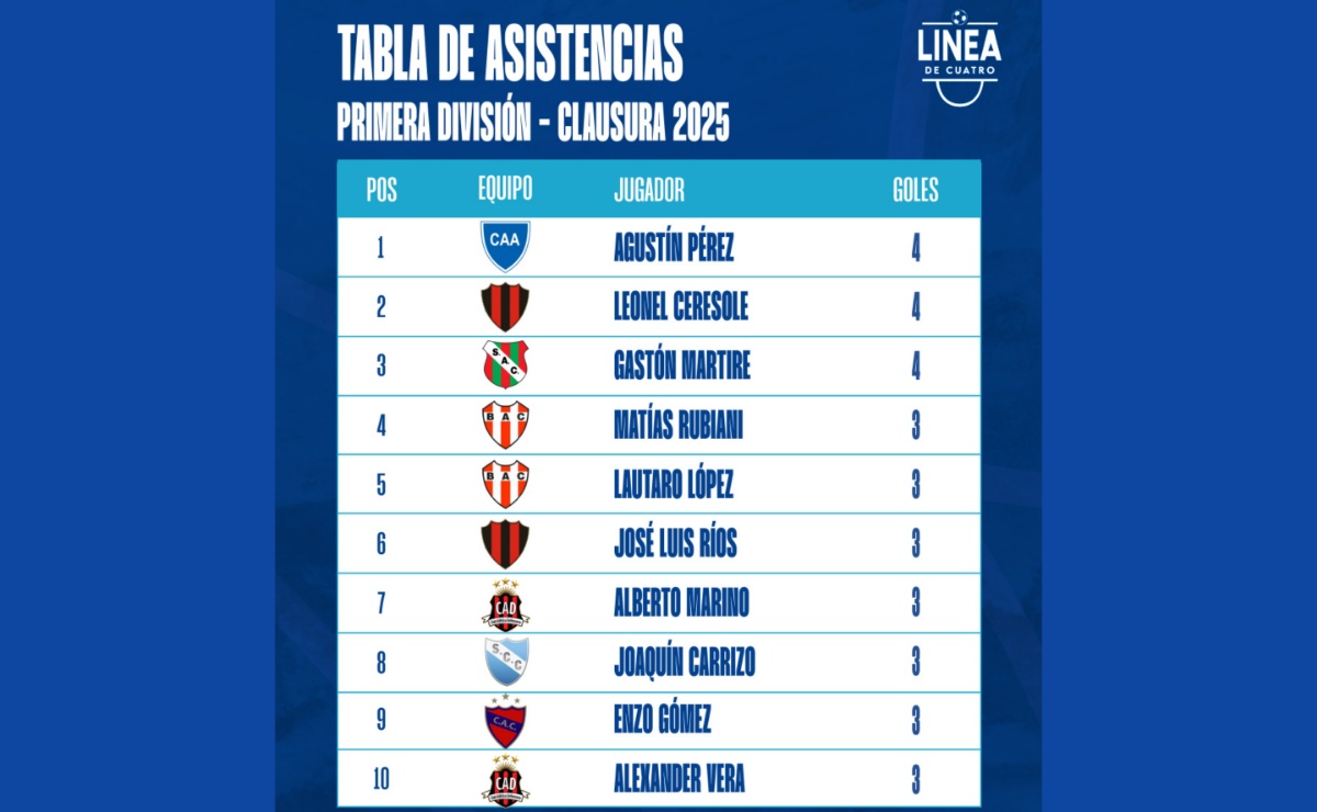 La tabla de asistencias de Primera División tras la Fecha 07 en las Zonas 1 y 3 y la Fecha 08 de la Zona 2 del Torneo Clausura 2025 de la Liga Cañadense.