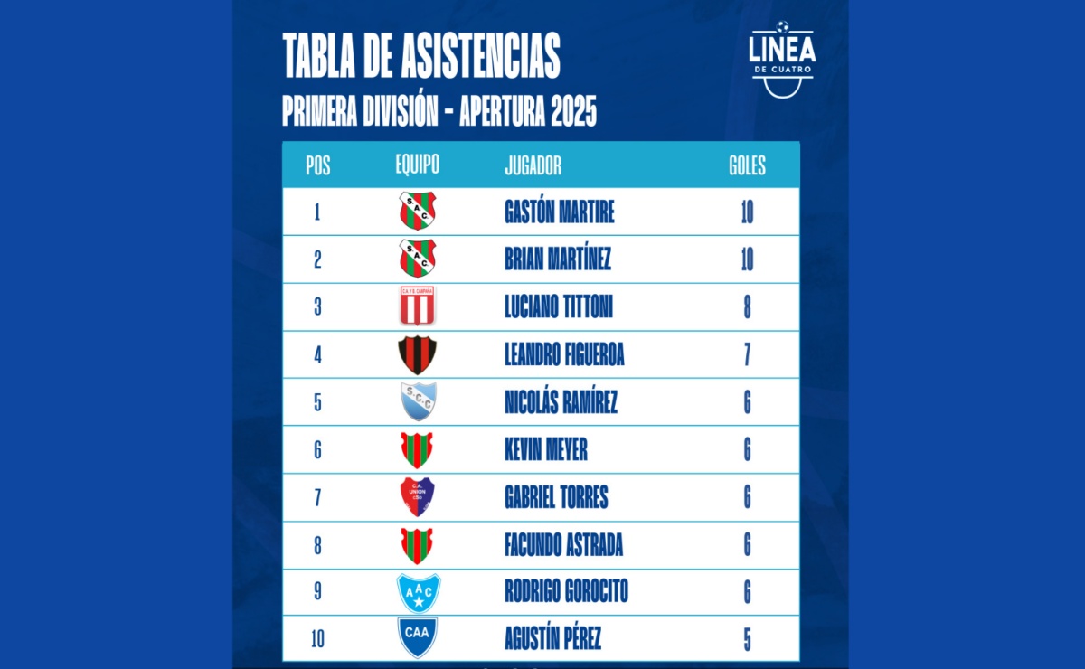 #LigaCañadenseDeFútbol Gastón Martire y Brian Martínez fueron los máximos asistidores de la fase regular del Torneo Apertura 2025 de Primera División. Los delanteros de Sportivo dieron 10 pases gol cada uno en las 18 fechas del campeonato. Felicitaciones @gaston.martire99 y @chueko.10 !!! Por detrás ellos, aparecen Luciano Tittoni (Campaña) con 8 y Leandro Figueroa (Cremería)