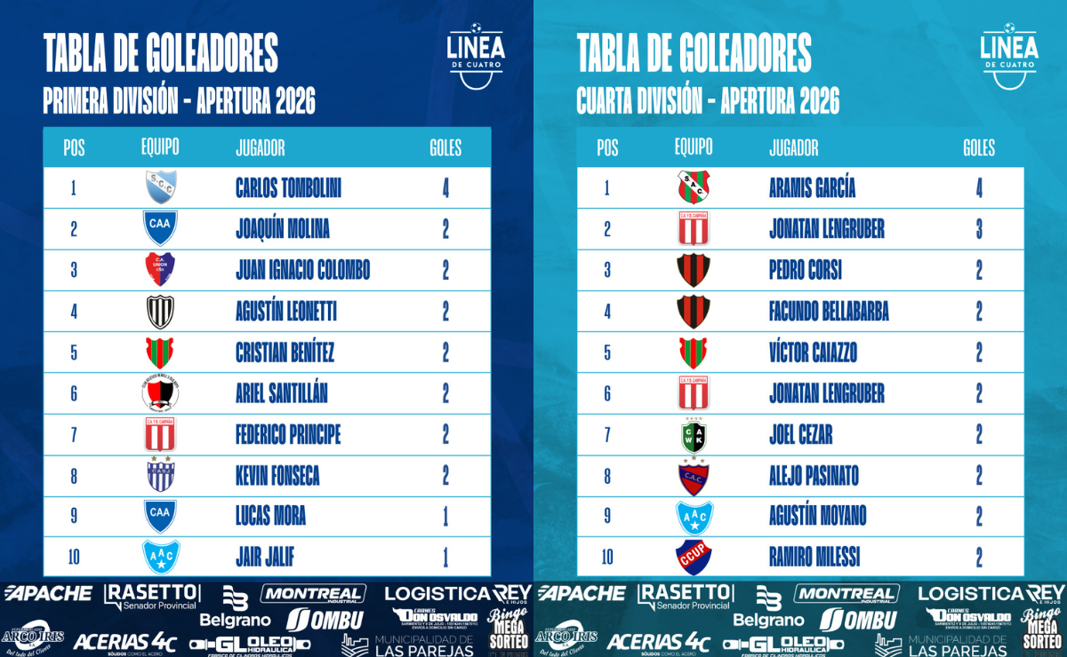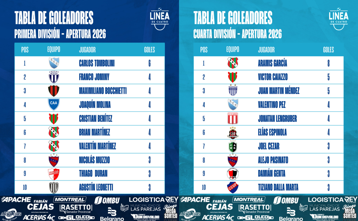 #LigaCañadenseDeFútbol La tabla de goleadores tras la Fecha 03 del Torneo Apertura 2026 de Primera y Cuarta División de la Liga Cañadense.