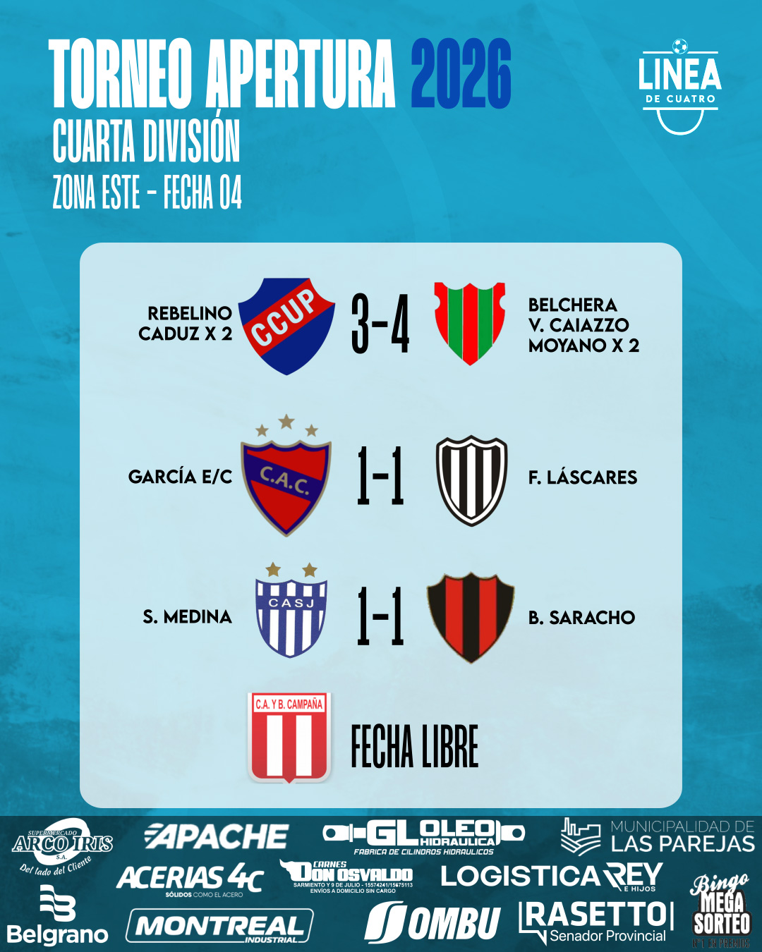 #LigaCañadenseDeFútbol Se jugó la Fecha 04 del Torneo Apertura 2026 de Cuarta División de la Liga Cañadense y acá te dejamos los resultados y posiciones.