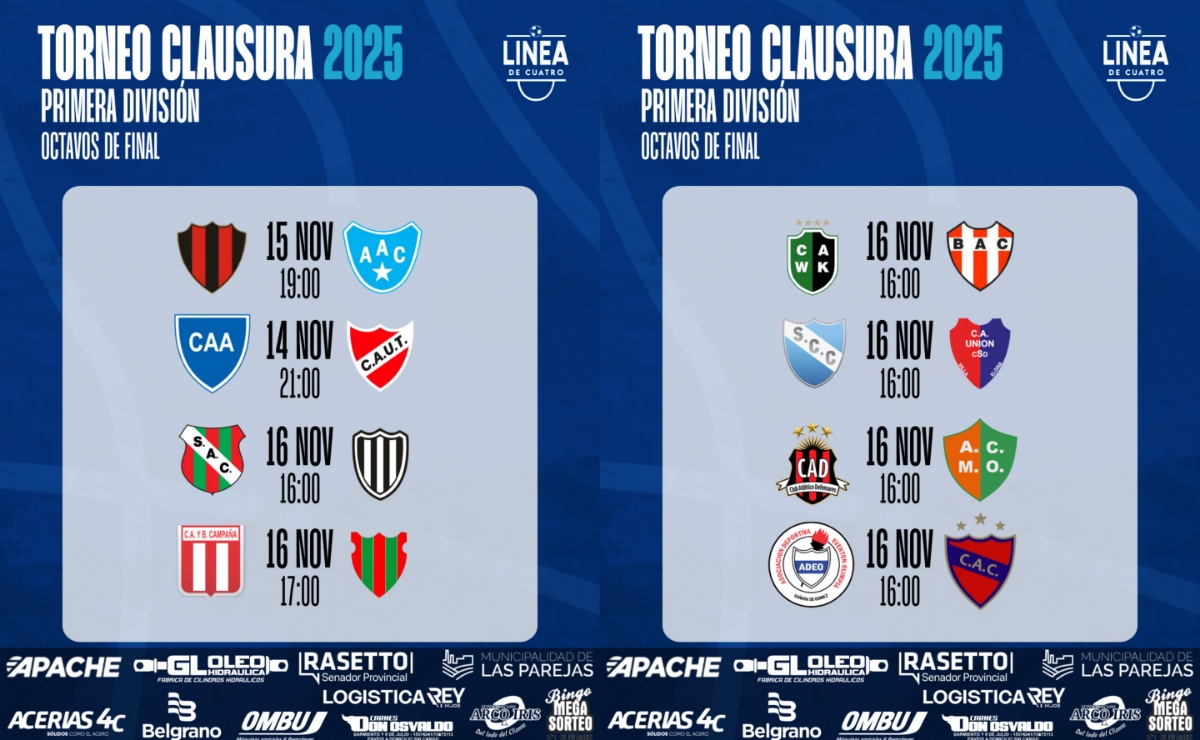 • PROGRAMACIÓN • #LigaCañadenseDeFútbol Así se jugarán las Semifinales del Torneo Clausura 2025 de Primera y Cuarta División de la Liga Cañadense de Fútbol. Semifinales – Primera División DOMINGO 30/11 – 17:00 hs 👉 Carcarañá – Sportivo 👉 Sport – Montes de Oca (en Correa) Semifinales – Cuarta División VIERNES 28/11 – 20:45 hs 👉
