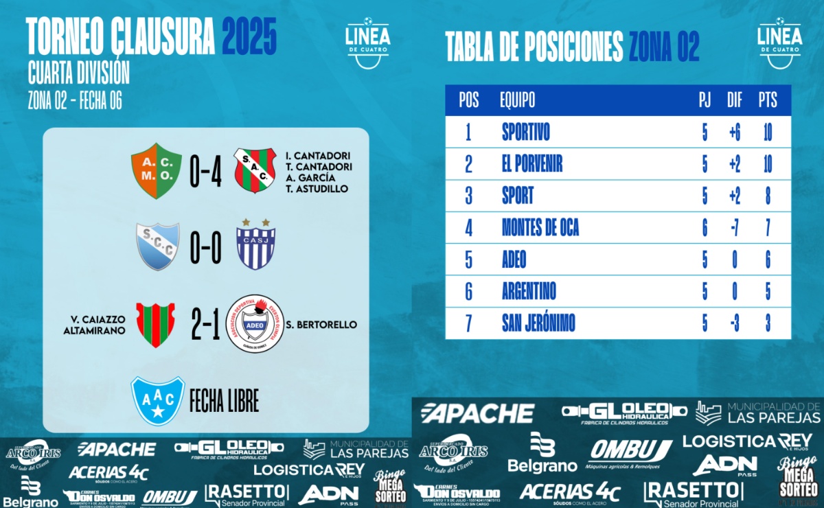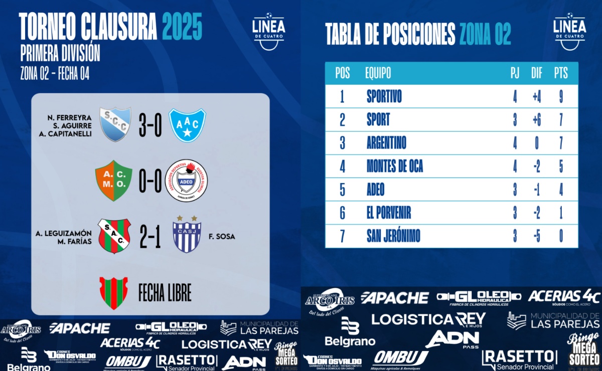 #LigaCañadenseDeFútbol Se jugó la Fecha 04 en la Zona 2 del Torneo Clausura 2025 de Cuarta División de la Liga Cañadense y acá te dejamos los resultados y posiciones. 👉Sport goleó a Argentino. 👉Montes de Oca y ADEO repartieron puntos. 👉Sportivo le costó pero venció a San Jerónimo.