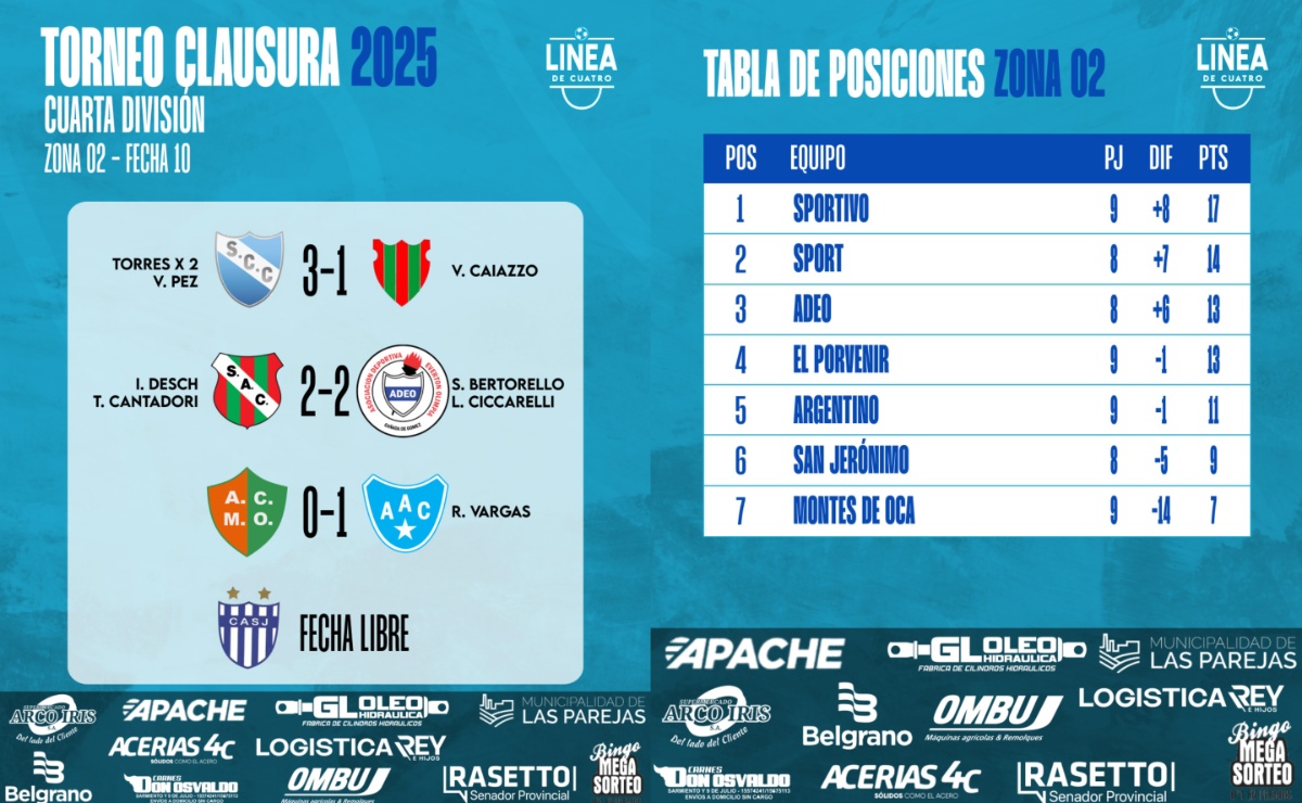 #LigaCañadenseDeFútbol Se jugó la Fecha 10 de la Zona 2 del Torneo Clausura 2025 de Cuarta División de la Liga Cañadense y acá te dejamos los resultados y posiciones.