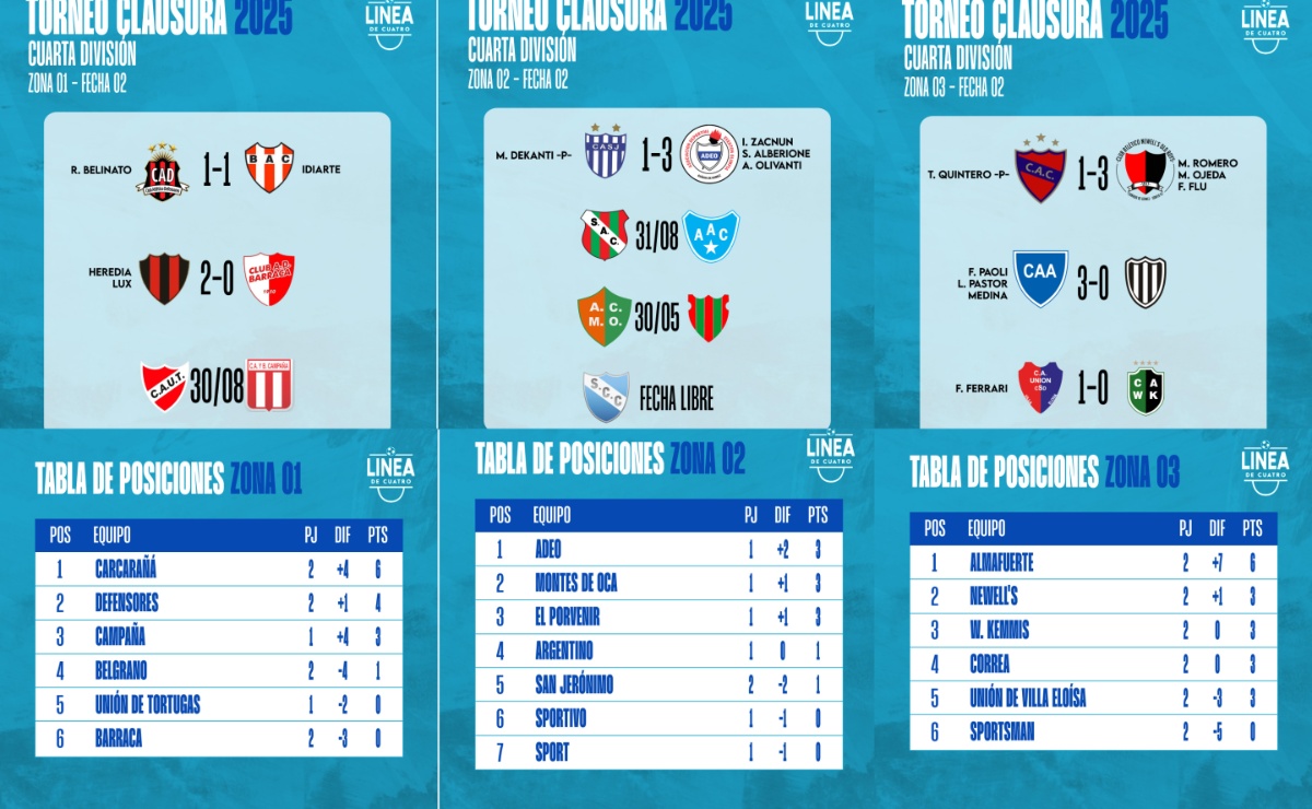 #LigaCañadenseDeFútbol Se jugó gran parte de la Fecha 02 del Torneo Clausura 2025 de Cuarta División de la Liga Cañadense y acá te dejamos los resultados y posiciones.