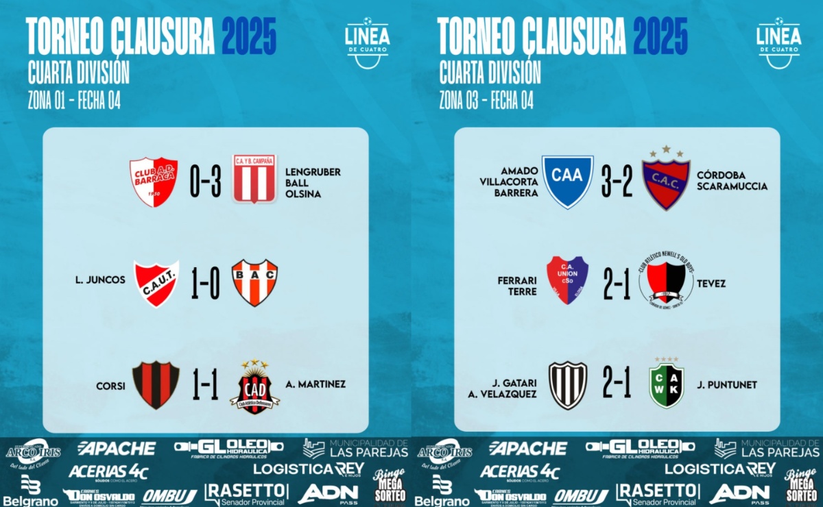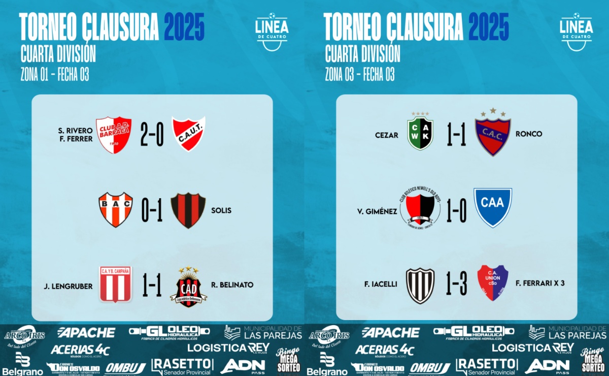#LigaCañadenseDeFútbol Se jugó la Fecha 04 en la Zona 1 y en la Zona 3 del Torneo Clausura 2025 de Cuarta División de la Liga Cañadense y acá te dejamos los resultados y posiciones.