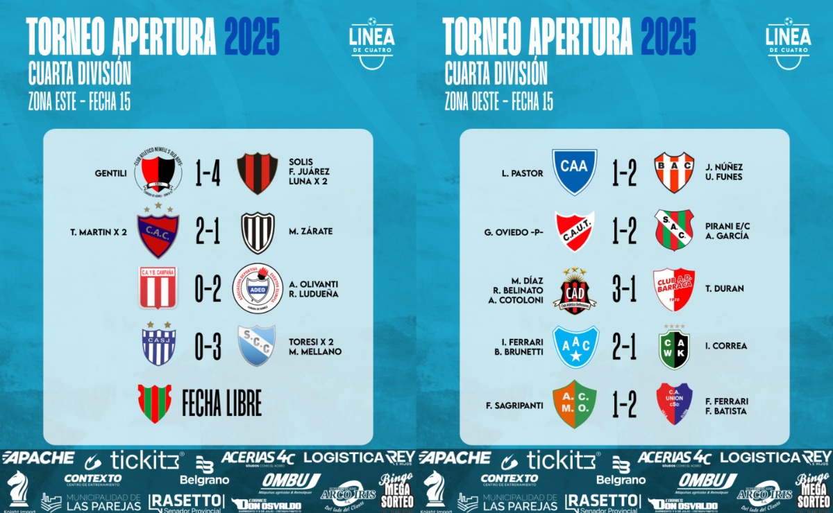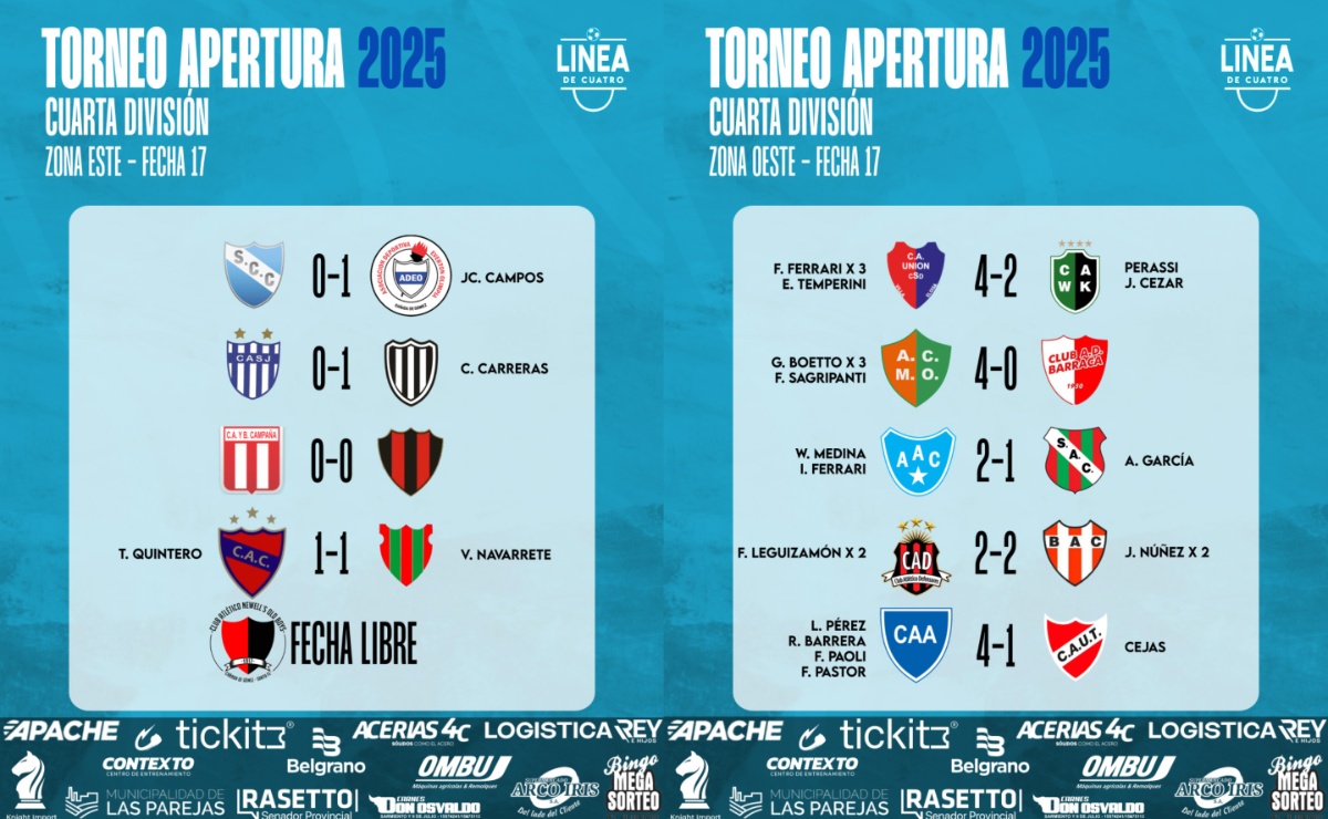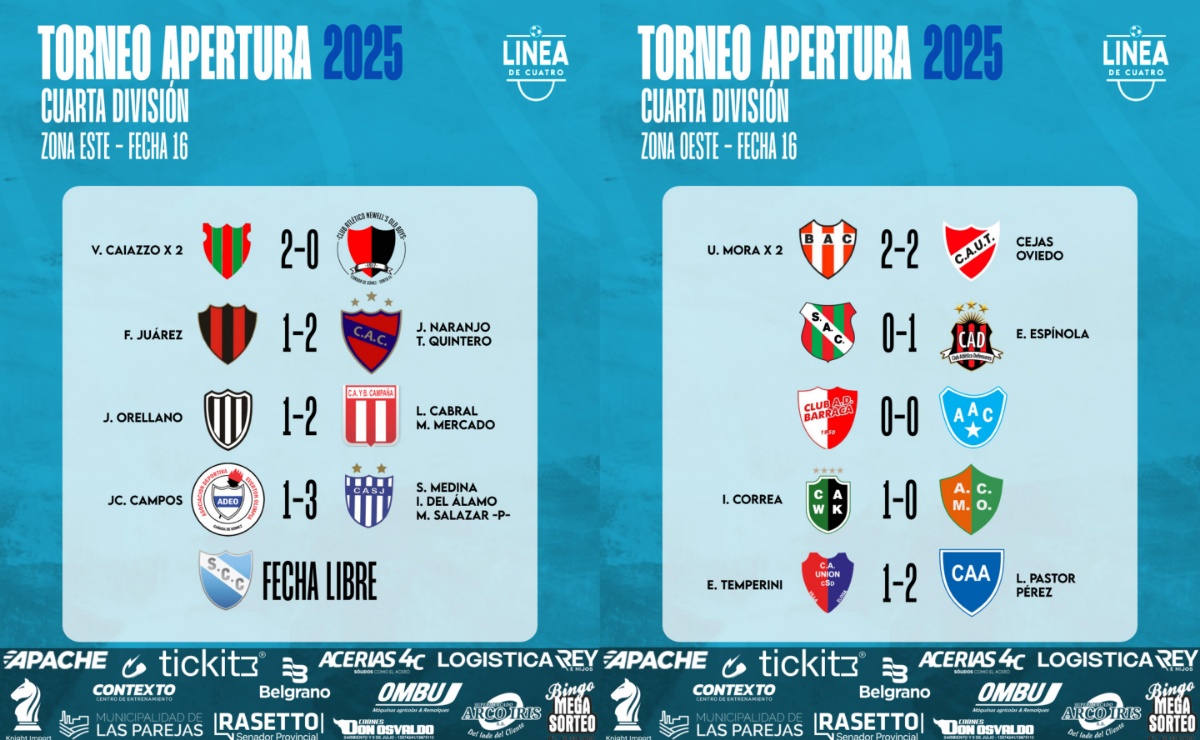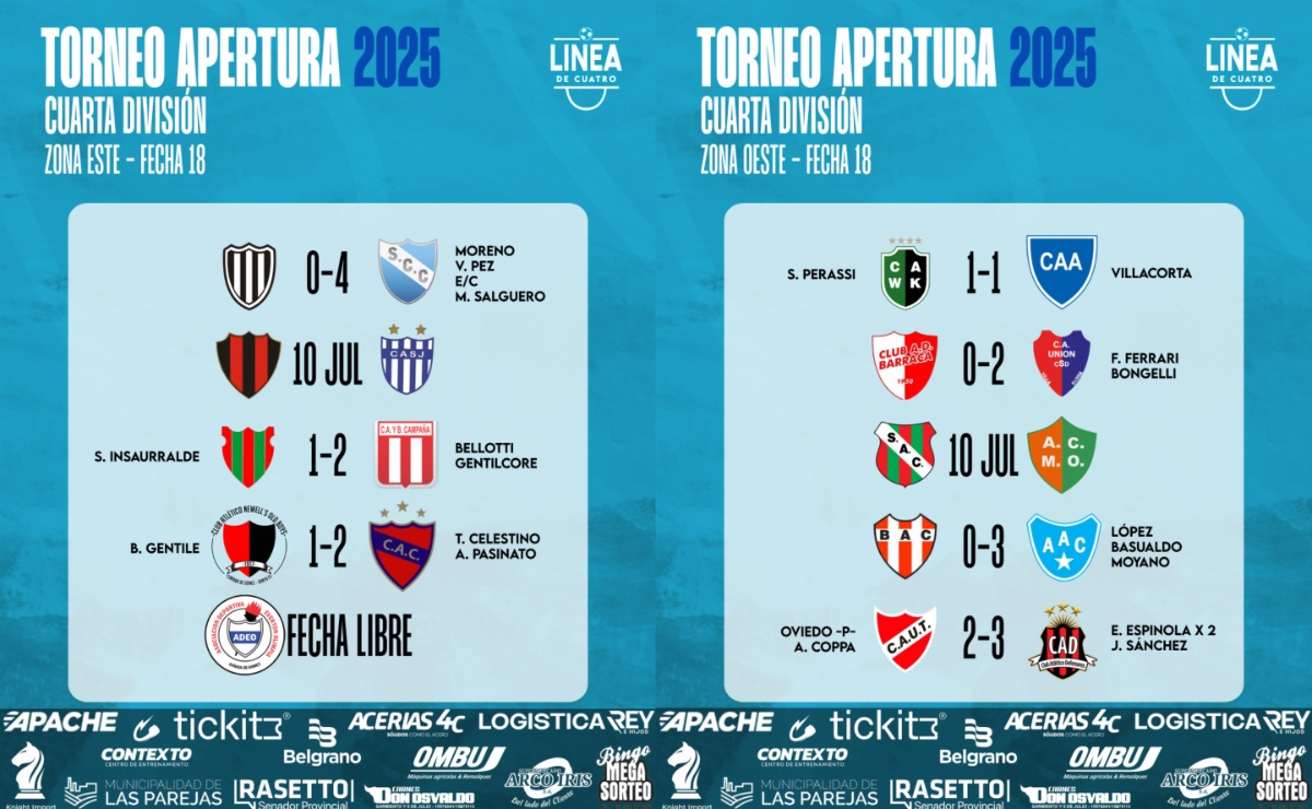 #LigaCañadenseDeFútbol Se completó la Fecha 18, la última, del Torneo Apertura 2025 de Cuarta División de la Liga Cañadense y acá te compartimos los resultados y posiciones. En Reserva clasifican directamente a Cuartos de Final los cuatro primeros de cada zona. 👉Sport goleó en Roldán y terminó primero.👉Cremería juega mañana y ya no se modifica