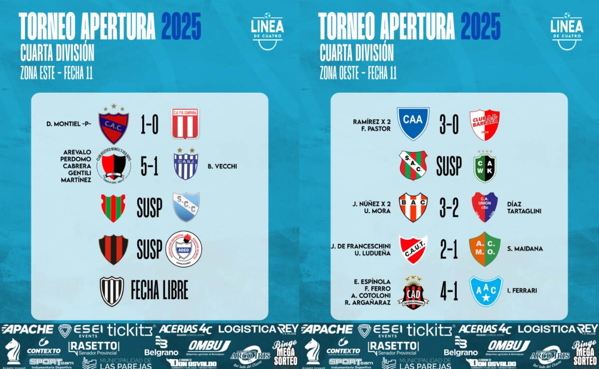 #LigaCañadenseDeFútbol Se jugó parte de la Fecha 11 del Torneo Apertura 2025 de Cuarta División de la Liga Cañadense y acá te compartimos los resultados y posiciones. *Sportivo vs W. Kemmis se suspendió por falta de luz. *El Porvenir vs Sport se suspendió por la tormenta. *Cremería vs ADEO se suspendió por la tormenta. Se