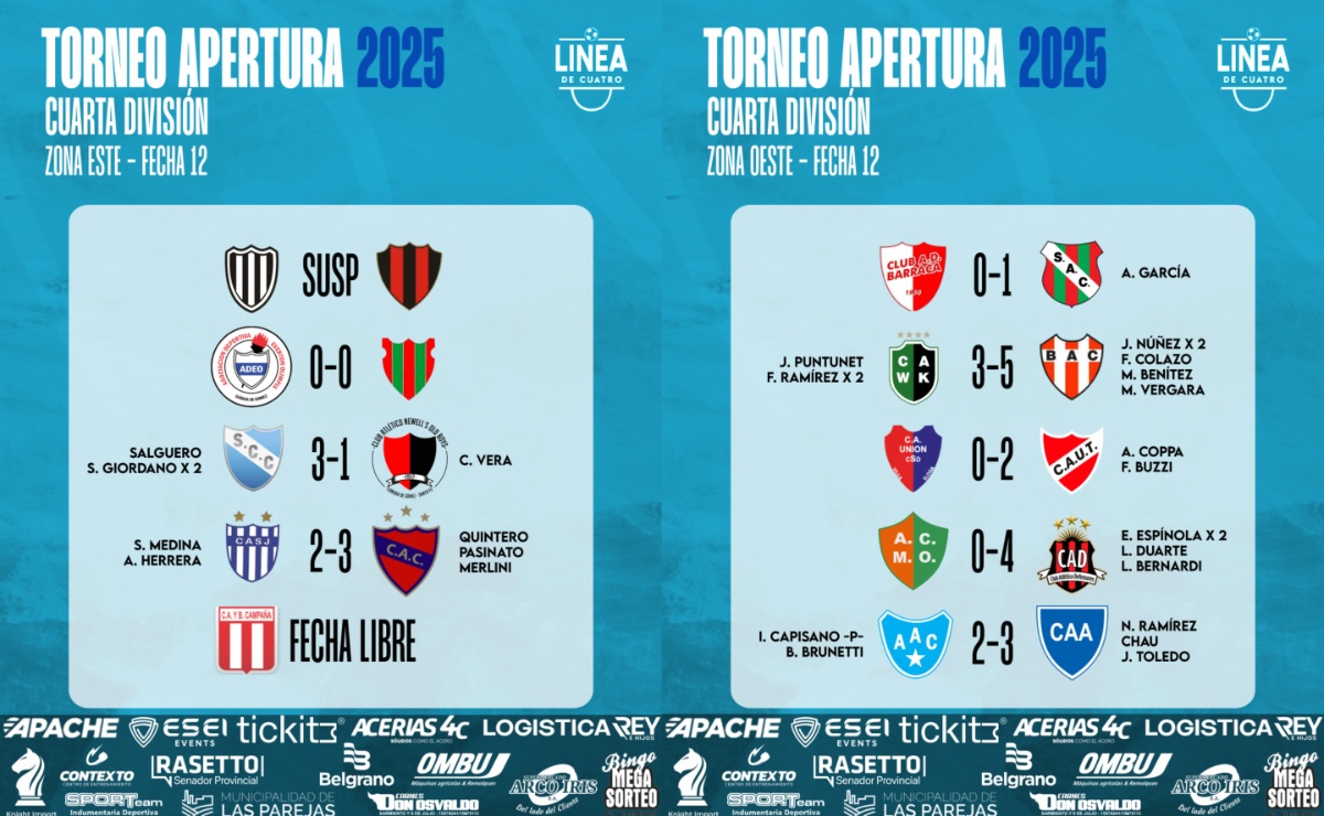 #LigaCañadenseDeFútbol Se jugó la Fecha 12 del Torneo Apertura 2025 de Cuarta División de la Liga Cañadense y acá te compartimos los resultados y posiciones. *Sportsman vs Cremería se suspendió por falta de médico.