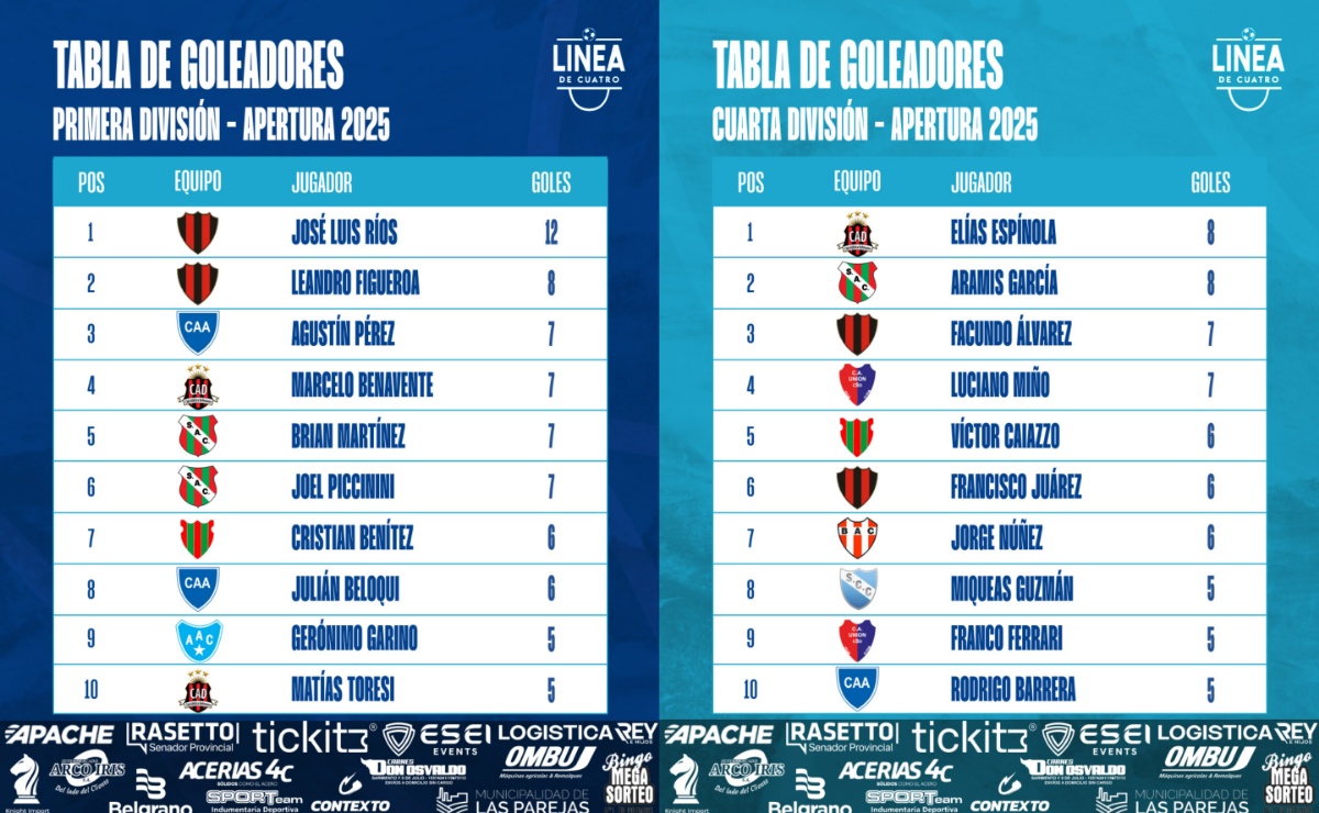 #LigaCañadenseDeFútbol La tabla de goleadores de Primera y Cuarta División tras la Fecha 12 del Torneo Apertura 2025 de la Liga Cañadense.