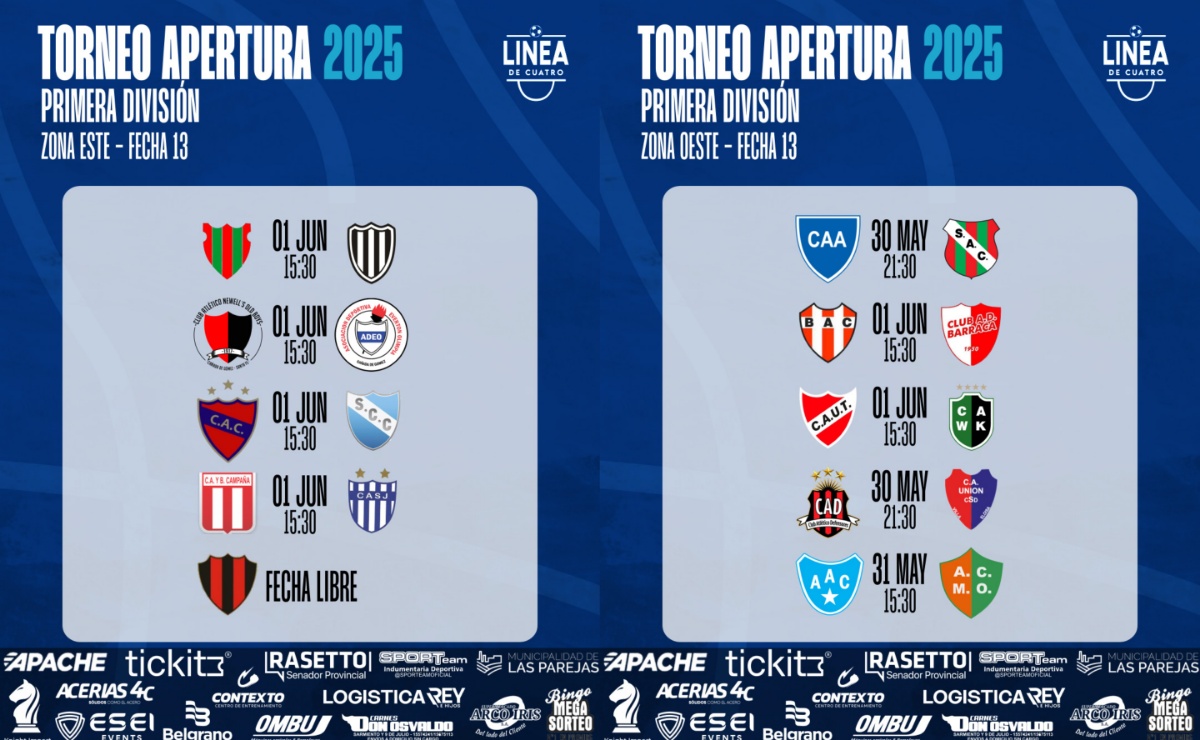 • PROGRAMACIÓN • #LigaCañadenseDeFútbol Así se jugará la Fecha 13 del Torneo Apertura 2025 de Primera y Cuarta División. Zona Este – Fecha 13 DOMINGO 01/06 – 13:30 hs y 15:30 hs 👉 El Porvenir – Sportsman Árbitro: Alberto Ramírez 👉 Newell’s – ADEO Árbitro: Diego Saracho 👉 Correa – Sport Árbitro: Luca Pedrozo 👉