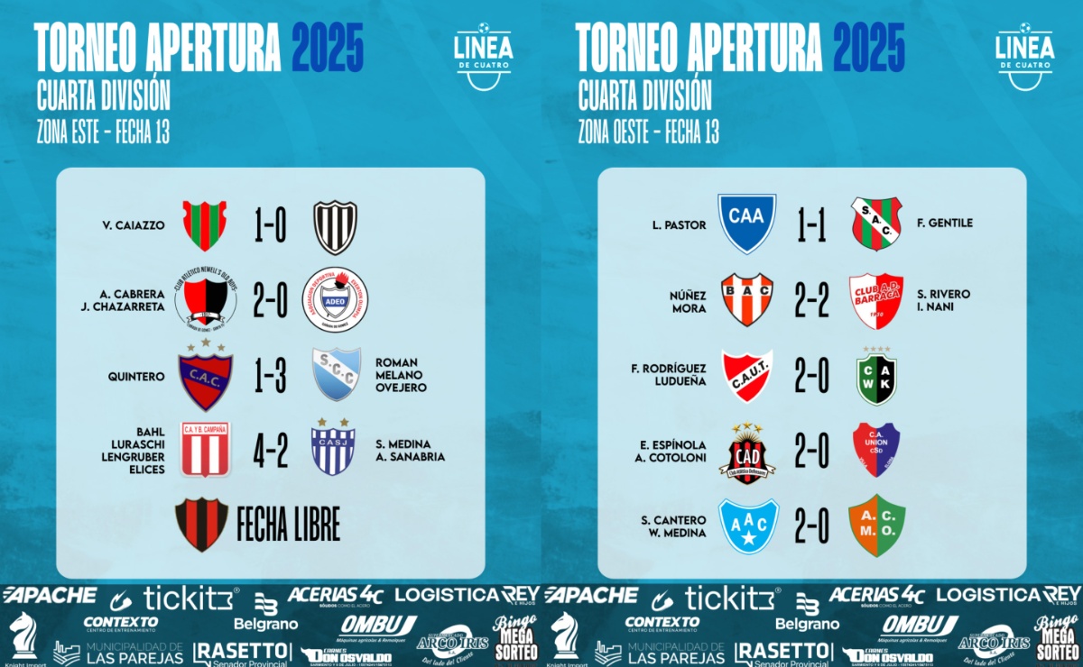 #LigaCañadenseDeFútbol Se jugó la Fecha 13 del Torneo Apertura 2025 de Cuarta División de la Liga Cañadense y acá te compartimos los resultados y posiciones.