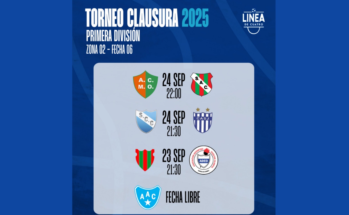 • PROGRAMACIÓN • #LigaCañadenseDeFútbol Así se jugará la Fecha 06 el Torneo Apertura 2026 de Primera y Cuarta División de la Liga Cañadense de Fútbol. Zona Este – Fecha 06 VIERNES 27/03 – 19:30 hs y 21:30 hs 👉 Campaña – Sportsman Árbitro: Oscar Santillán DOMINGO 29/03 – 14:00 hs y 16:00 hs 👉 Correa
