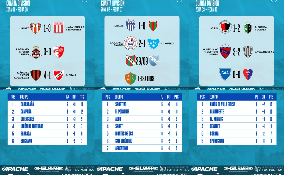 #LigaCañadenseDeFútbol Se jugó la Fecha 06 de las Zonas 1 y 3 y la Fecha 07 de la Zona 2 del Torneo Clausura 2025 de Cuarta División de la Liga Cañadense y acá te dejamos los resultados y posiciones.