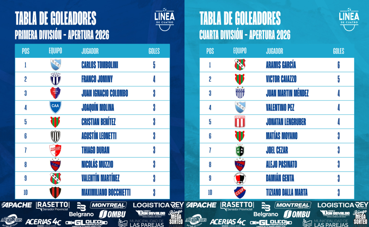 #LigaCañadenseDeFútbol La tabla de goleadores tras la Fecha 06 del Torneo Apertura 2026 de Primera y Cuarta División de la Liga Cañadense.