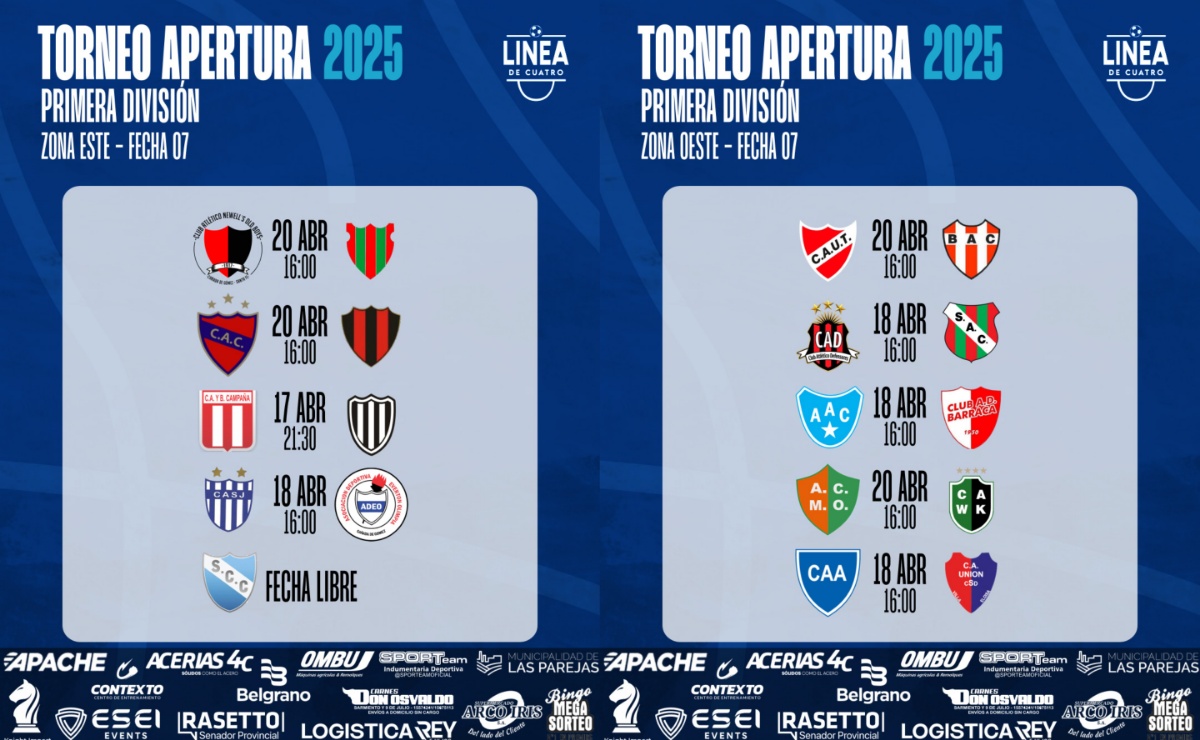 • PROGRAMACIÓN •#LigaCañadenseDeFútbol Así se jugará la fecha 07 del Torneo Apertura 2025 de Primera y Cuarta División. Zona Este – Fecha 07 JUEVES 18/04 – 19:30 hs y 21:30 hs👉 Campaña – Sportsman VIERNES 19/04 – 14:00 hs y 16:00 hs👉 San Jerónimo – ADEO DOMINGO 20/04 – 14:00 hs y 16:00 hs👉 Newell’s