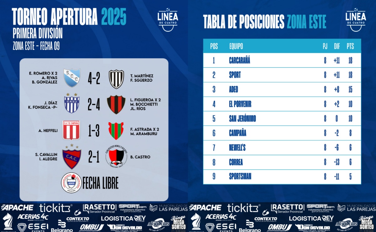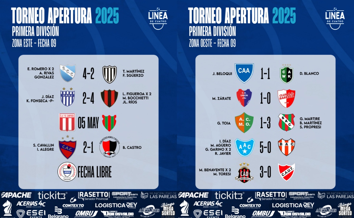 Zona Oeste – Fecha 09 VIERNES 17/04 – 19:30 hs y 21:30 hsAlmafuerte 3-0 Belgrano – FINALGOLES: 32′ PT Joaquín Molina (A), 6′ ST Julián Giménez (A), 20′ ST Lucas Mora (A)Árbitro: Oscar SantillánCuarta División: Almafuerte 4-2 Belgrano SÁBADO 18/04 – 14:00 hs y 16:00 hsArgentino 2-1 Sportivo – FINALGOLES: 18′ PT Joel Barrio (S),