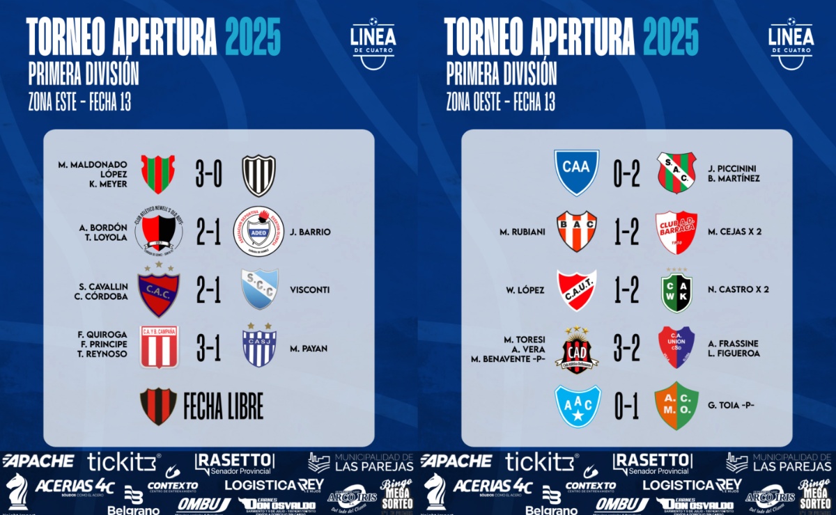 #LigaCañadenseDeFútbol Línea de Cuatro eligió al equipo ideal de la Fecha 13 del Torneo Apertura 2025 de Primera División. ✋Arquero: 👉Federico Dei Cas fue clave en el triunfo de NOB ante ADEO. Tapó un penal y un mano a mano. Excelente nivel también de Gianfranco Gorreta en el Defe y de Alejo Devotto en Correa.