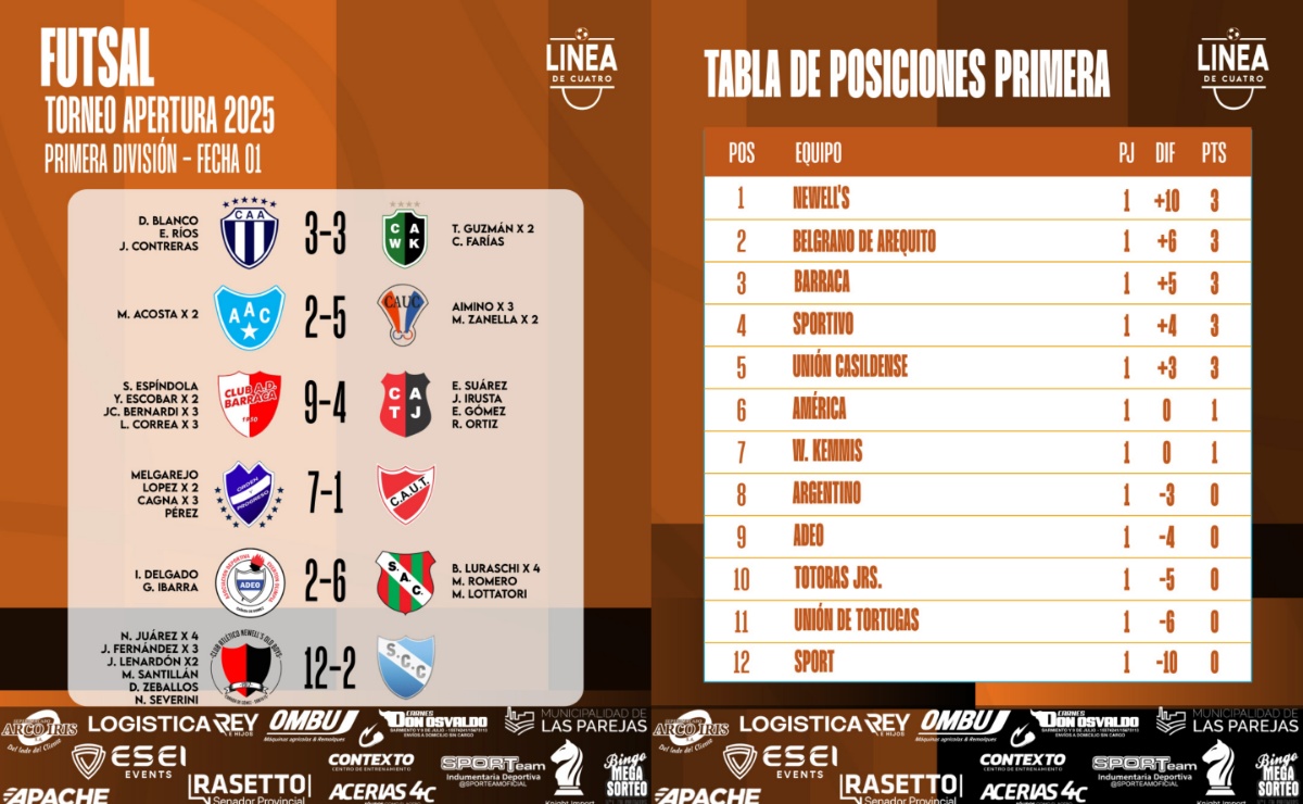 #LigaCañadenseDeFútbol Se jugó la primera fecha del Torneo Apertura 2025 de Primera División y Reserva del Futsal de la Liga Cañadense y acá te compartimos los resultados y posiciones.