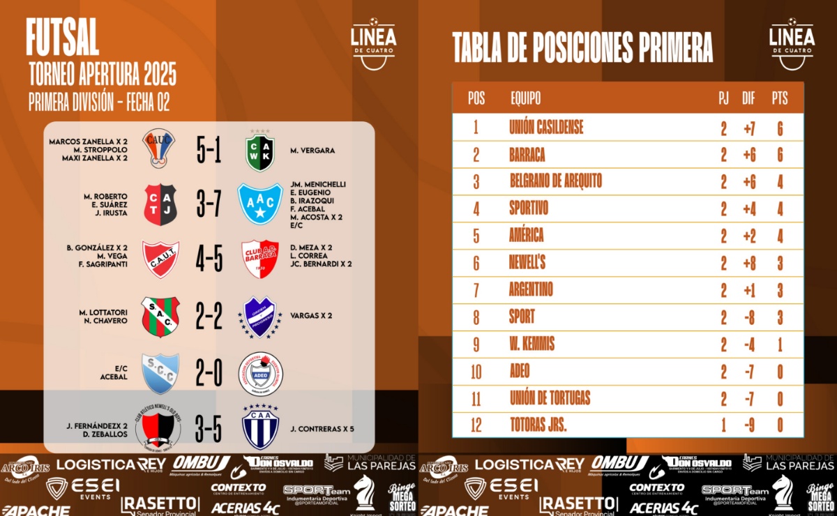 #LigaCañadenseDeFútbol Se jugó la Fecha 02 del Torneo Apertura 2025 de Primera División y Reserva del Futsal de la Liga Cañadense y acá te compartimos los resultados y posiciones.