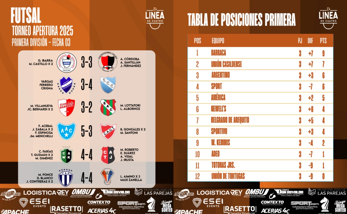 #LigaCañadenseDeFútbol Se jugó la Fecha 03 del Torneo Apertura 2025 de Primera División y Reserva del Futsal de la Liga Cañadense y acá te compartimos los resultados y posiciones.