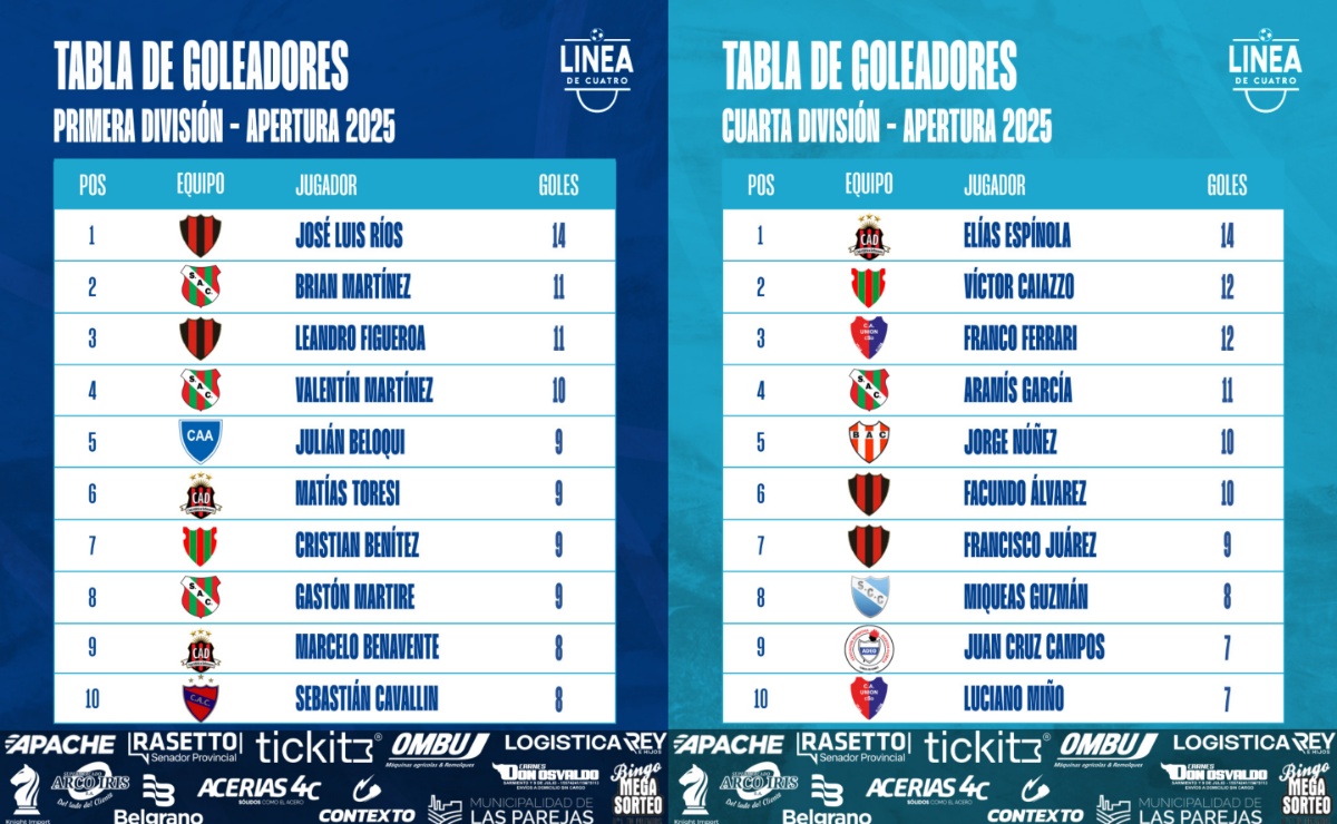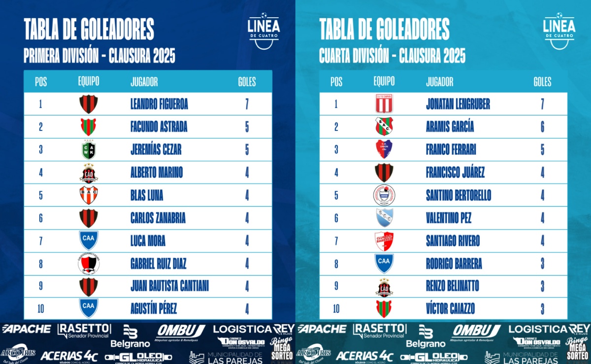 #LigaCañadenseDeFútbol La tabla de goleadores de Primera y Cuarta División tras la Fecha 06 en las Zonas 1 y 3 y la Fecha 07 de la Zona 2 del Torneo Clausura 2025 de la Liga Cañadense.