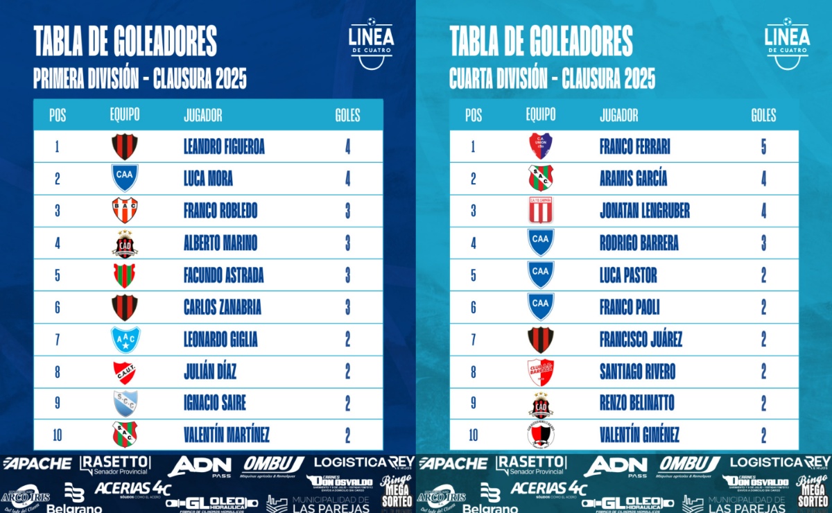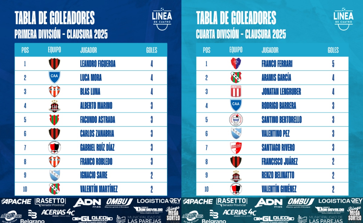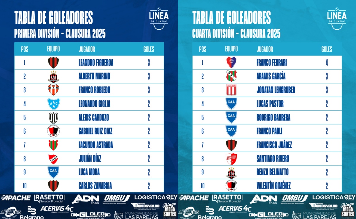 #LigaCañadenseDeFútbol La tabla de goleadores de Primera y Cuarta División tras la Fecha 04 del Torneo Clausura 2025 de la Liga Cañadense.