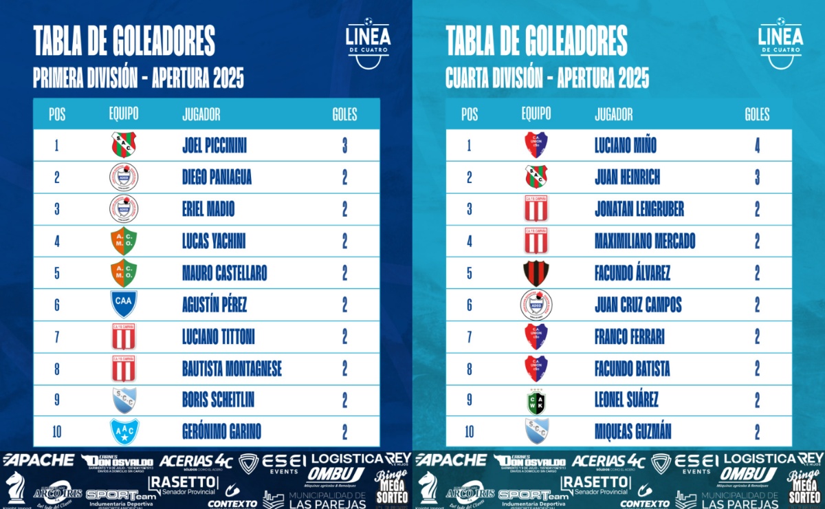 #LigaCañadenseDeFútbol La tabla de goleadores de Primera y Cuarta División tras la Fecha 02 del Torneo Apertura 2025 de la Liga Cañadense.