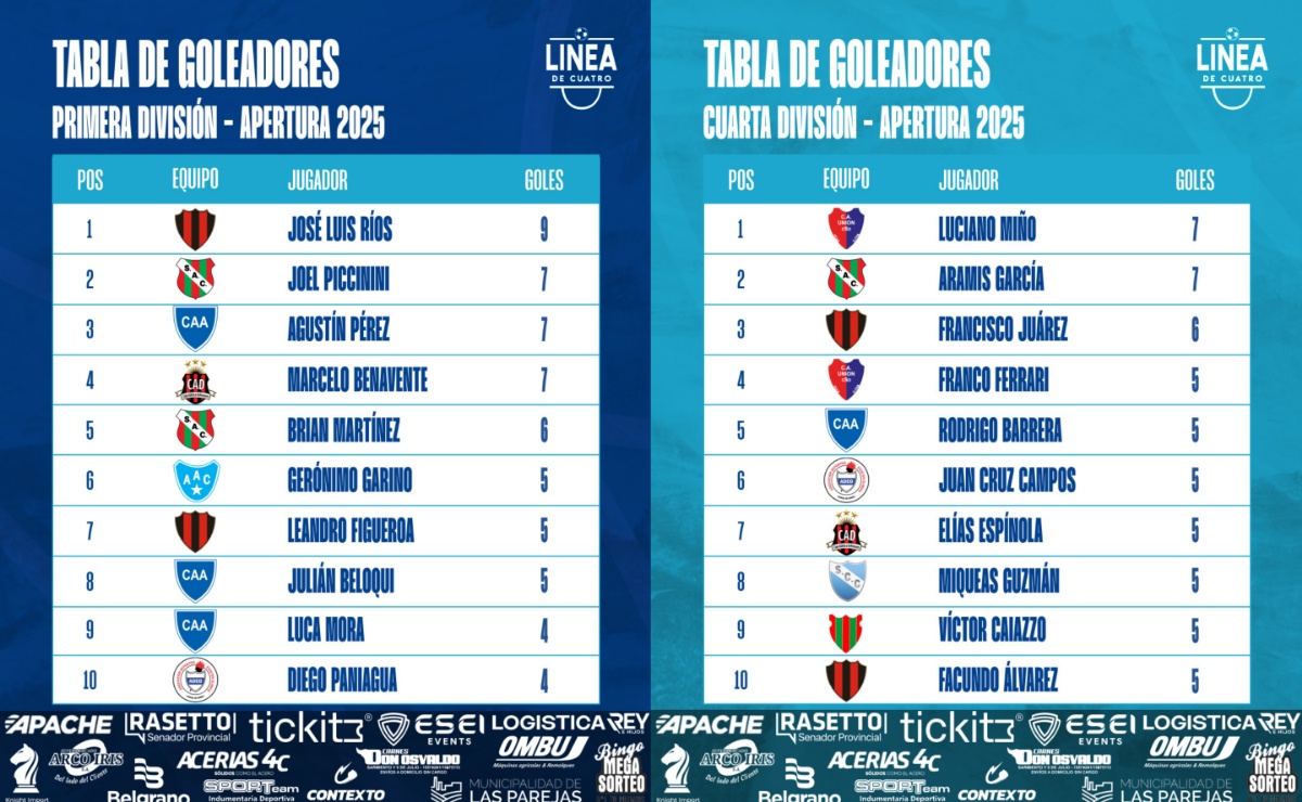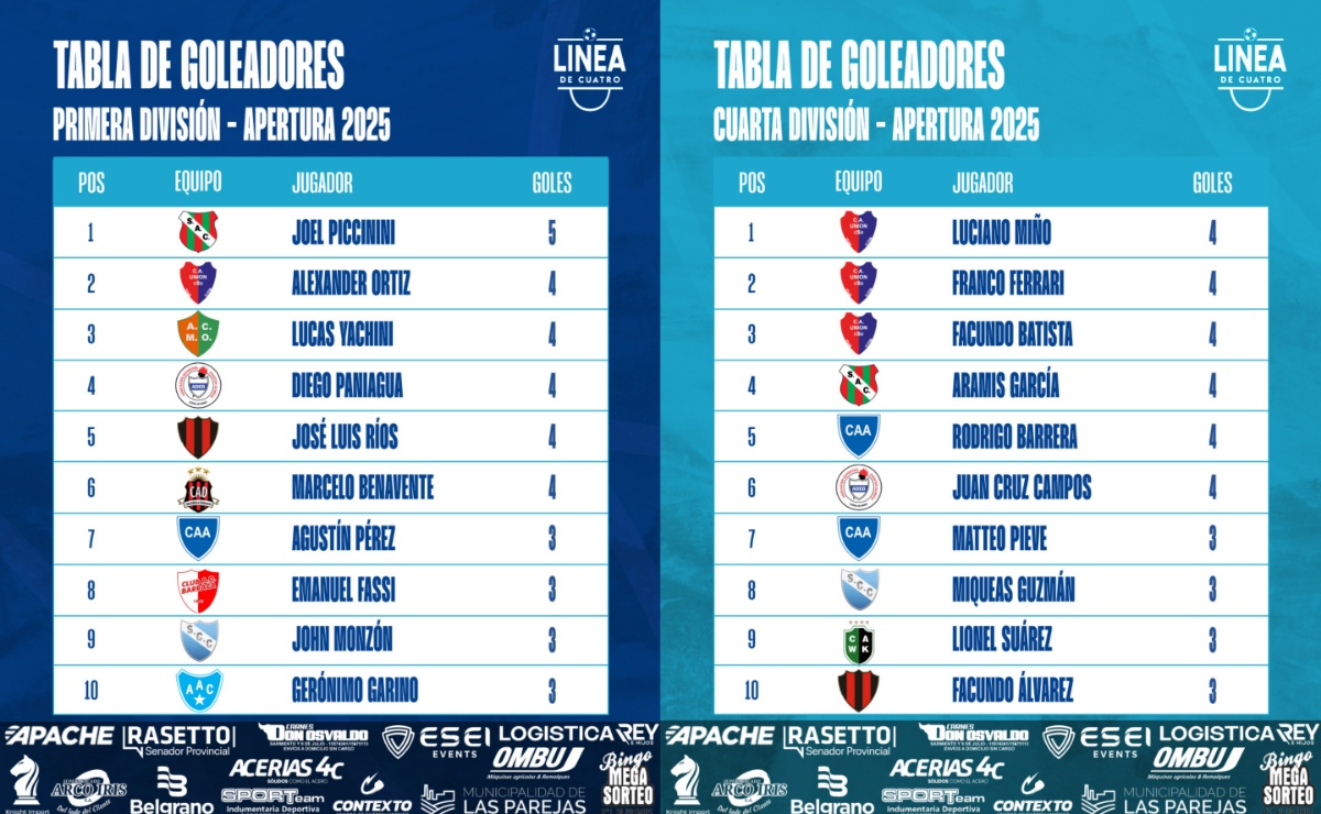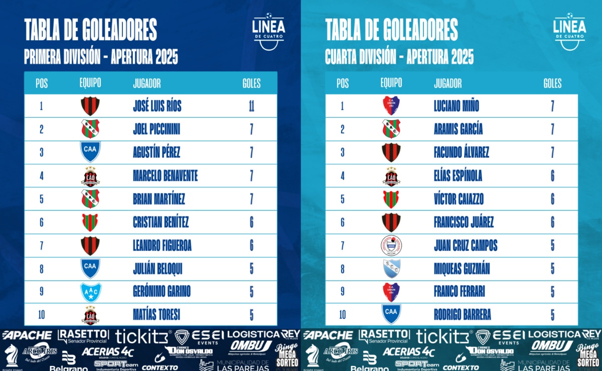 #LigaCañadenseDeFútbol La tabla de goleadores de Primera y Cuarta División tras la Fecha 05 del Torneo Apertura 2025 de la Liga Cañadense.