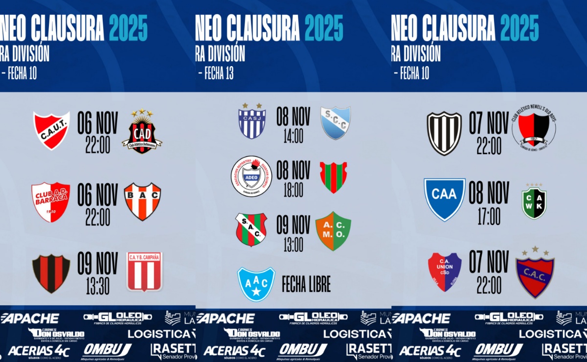 • PROGRAMACIÓN • #LigaCañadenseDeFútbol Así se jugará la Fecha 10 de las Zona 1 y 3 y la Fecha 13 de la Zona 2 del Torneo Clausura 2025 de Primera y Cuarta División de la Liga Cañadense de Fútbol. Zona 01 – Fecha 10 JUEVES 06/11 – 20:00 hs y 22:00 hs 👉 Unión de