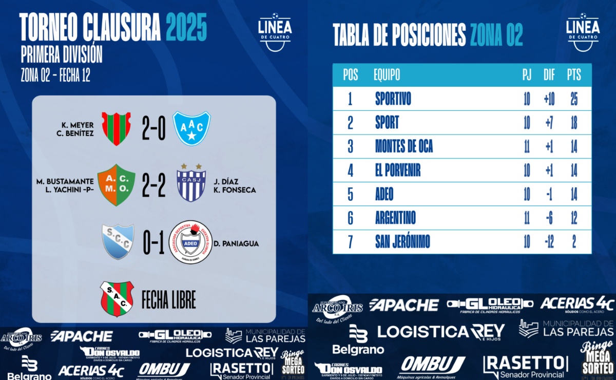 #LigaCañadenseDeFútbol Se jugó la Fecha 12 de la Zona 2 del Torneo Clausura 2025 de Primera División de la Liga Cañadense y acá te dejamos las posiciones.