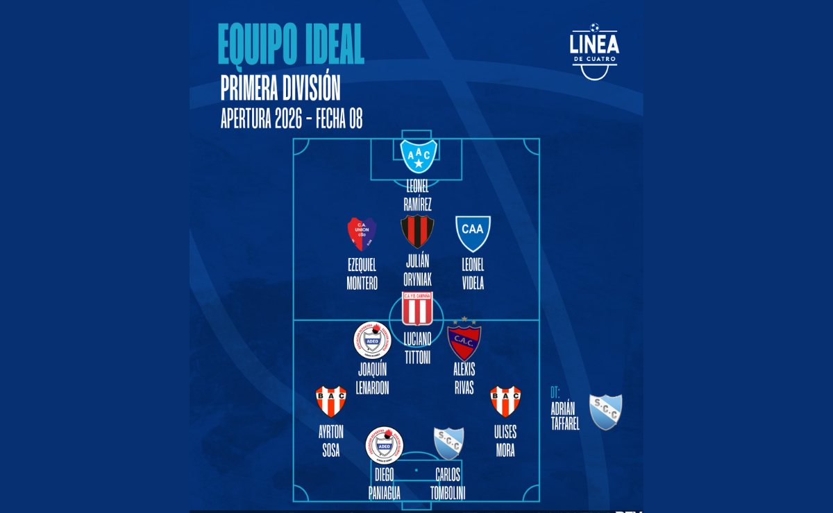 #LigaCañadenseDeFútbol Línea de Cuatro eligió al equipo ideal de la Fecha 08 del Torneo Apertura 2026 de Primera División. ✋Arquero: 👉Leonel Ramírez tuvo un par de intervenciones clave para que Argentino mantenga el arco en cero en Las Rosas. 🛡Defensores: 👉Ezequiel Montero fue el motor de Unión y pisó el área generando dos penales. 👉Julián