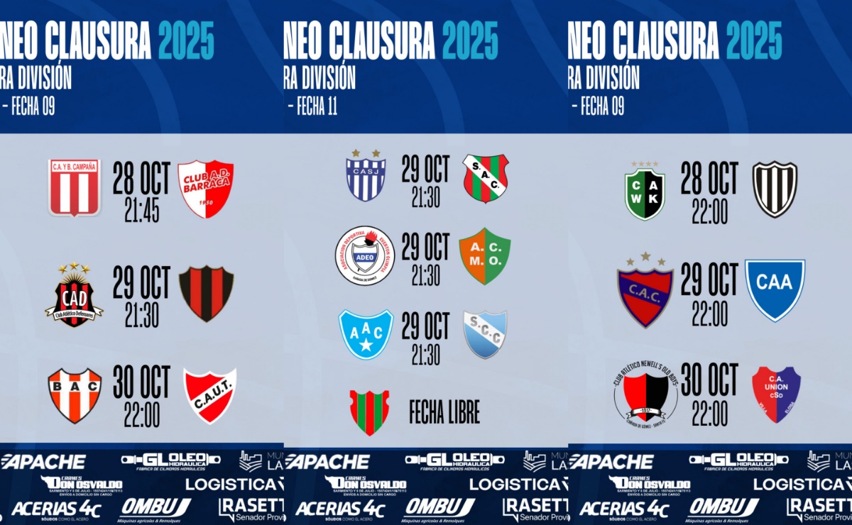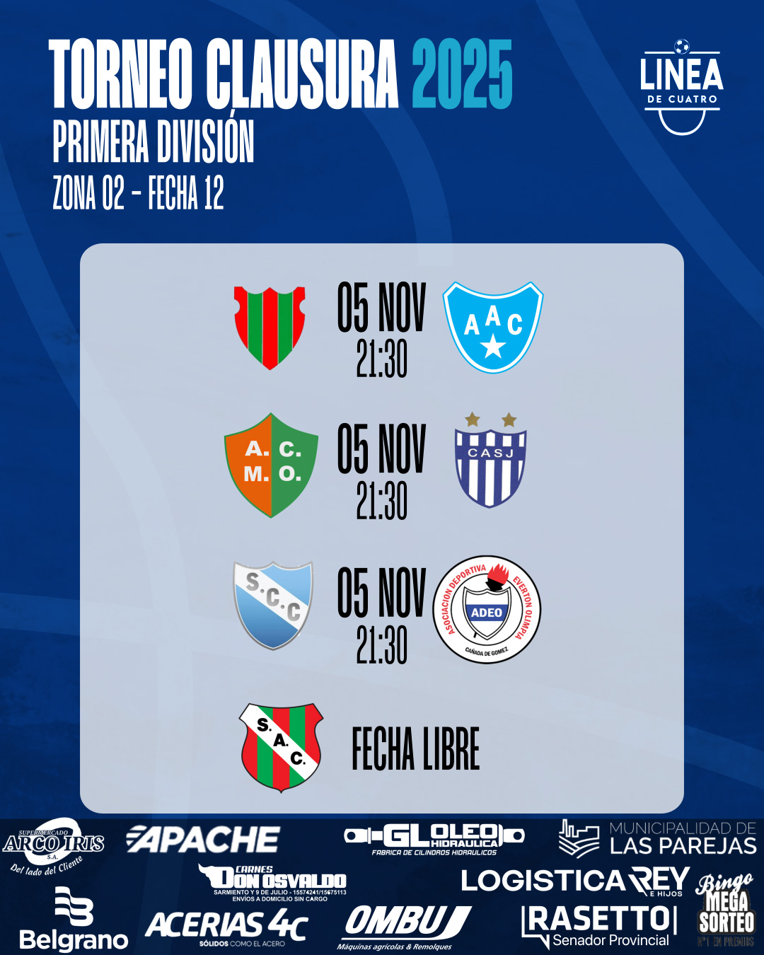 • PROGRAMACIÓN • #LigaCañadenseDeFútbol Así se jugará la la Fecha 12 de la Zona 2 del Torneo Clausura 2025 de Primera y Cuarta División de la Liga Cañadense de Fútbol. Zona 02 – Fecha 12 MIÉRCOLES 05/11 – 19:30 hs y 21:30 hs 👉 El Porvenir – Argentino Árbitro: Luca Pedrozo 👉 Montes de Oca