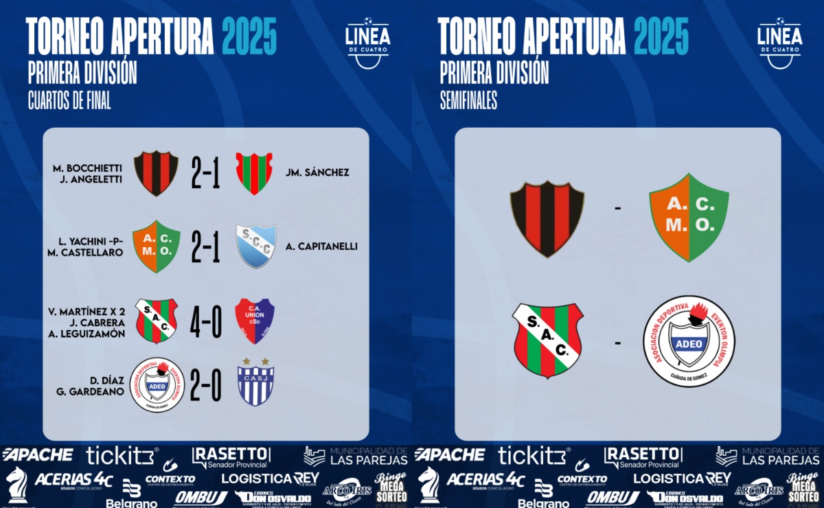#LigaCañadenseDeFútbol Así se jugarán las Semifinales del Torneo Apertura 2025 de Primera y Cuarta División. Semifinales – Primera División DOMINGO 03/08 – 15:00 hs 👉 Carcarañá – Montes de Oca Árbitros: Matías Coria, Adriel Gordillo, Carlos Colazzo, Luca Pedrozo 👉 Sportivo – ADEO Árbitros: Oscar Santillán, Mauro Montero, Edgardo Peralta, Alberto Ramírez Semifinales – Cuarta