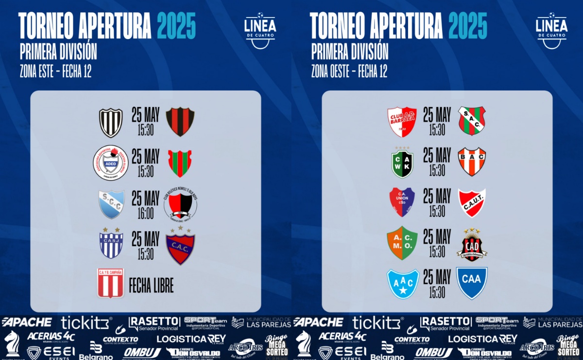 • PROGRAMACIÓN • #LigaCañadenseDeFútbol Así se jugará la fecha 12 del Torneo Apertura 2025 de Primera y Cuarta División. Zona Este – Fecha 12 DOMINGO 25/05 – 13:30 hs y 15:30 hs 👉 Sportsman – Carcarañá Árbitro: Oscar Santillán 👉 ADEO – El Porvenir Árbitro: Adrián Ramírez 👉 San Jerónimo – Correa Árbitro: Alberto Ramírez